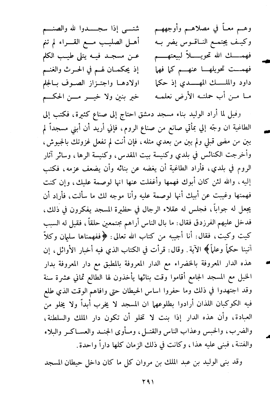 وقيل لما أراد الوليد بناء مسجد دمشق احتاج إلى صناع كثيرة فكتب إلى الطاغيه أن وجه إلي بمائتي صانع من صناع الروم فإني أريد أن أبني مسجدا لم يبن من مضى قبلي ولم يبن من بعدي مثله فإن أنت لم تفعل غزوتك بالجيوش وأخرجت الكنائس في بلدي وكنيسة بيت المقدس وكنيسة الرها وسائر آثار الروم في بلدي فأراد الطاغية أن يغضه عن بنائه وأن يضعف عزمه فكتب إليه والله لئن كان أبوك فهمها وأغفلت عنها إنها لوصمة عليك وإن فهمتها وغيبت عن أبيك إنها لوصمة عليه وأنا موجه لك ما سألت فأراد أن يجعل له جوابا فجلس له عقلاء الرجال في حظيرة المسجد يفكرون في ذلك فدخل عليهم الفرزدق فقال: ما بال الناس أراهم مجتمعين حلقا فقيل له السبب كيت وكيت فقال: أنا أجيبه من كتاب الله تعالى: {فَفَهَّمْنَاهَا سُلَيْمَانَ وَكُلّاً آتَيْنَا حُكْماً وَعِلْماً} الآية. وقال: قرأت في الكتاب الذي فيه أخبار الأوائل أن هذه الدار المعروفة بالخضراء مع الدار المعروفة بالمطبق مع دار المعروفة بدار الخيل مع المسجد الجامع أقاموا وقت بنائها يأخذون لها الطالع ثماني عشرة سنة وقد اجتهدوا في ذلك وما حفروا أساس الحيطان حتى وافاهم الوقت الذي طلع فيه الكوكبان اللذان أرادوا بطلوعهما أن المسجد لا يخرب أبدا ولا يخلو من العبادة وأن هذه الدار إذا بنت لا تخلو أن تكون دار الملك والسلطنة والضرب والحبس وعذاب الناس والقتل ومأوى الجند والعساكر والبلاء والفتنة فبنى عليه هذا وكانت في ذلك الزمان كلها دارا واحدة.