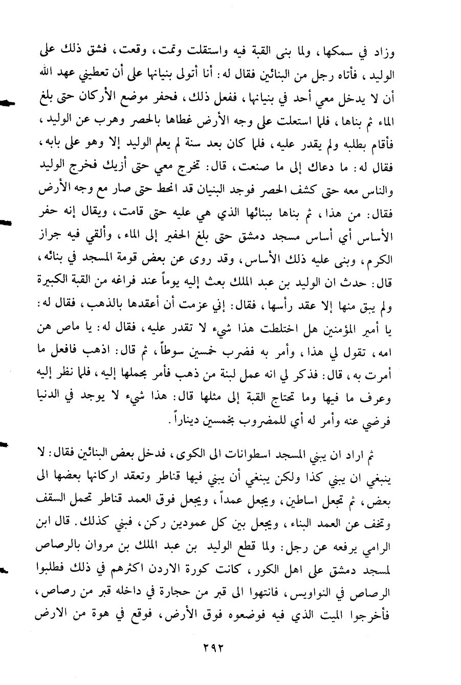 وزاد في سمكها ولما بنى القبة فيه وستقلت وتمت وقعت فشق ذلك على الوليد فاتاه رجل من البنائين فقال له: أنا أتولى بنيانها على أن تعطيني عهد الله أن لا يدخل معي أحد في بنيانها ففعل ذلك فحفر موضع الأركان حتى بلغ الماء ثم بناها فلما استعلت على وجه الأرض غطاها بالحصر وهرب عن الوليد فأقام بطلبه ولم يقدر عليه فلما كان بعد سنة لم يعلم الوليد إلا وهو على بابه فقال له: ما دعاك إلى ما صنعت قال: تخرج معي حتى أريك فخرج الوليد والناس معه حتى كشف الحصر فوجد البنيان قد انحط حتى صار مع وجه الأرض فقال: من هذا ثم بناها ببنائها الذي هي عليه حتى قامت ويقال أنه حفر الأساس أي أساس مسجد دمشق حتى بلغ الحفير إلى الماء واقي فيه جراز الكرم وبنى عليه ذلك الأساس وقد روى عن بعض قومه المسجد في بنائه قال: حدث أن الوليد بن عبد الملك بعث إليه يوما عند فراغه من القبة الكبيرة ولم يبق منها إلا عقد رأسها فقال: إني عزمت أن اعقدها بالذهب فقال له: يا أمير المؤمنين هل اختلطت هذا شيء لا تقدر عليه فقال له: يا ماص هن أمه تقول لي هذا وأمر به فضرب خمسين سوطا ثم قال: اذهب فافعل ما أمرت به قال: فذكر لي أنه عمل لبنة من ذهب فأمر بحملها إليه فلما نظر إليه وعرف ما فيها وما تحتاج القبة إلى مثلها قال: هذا شيء لا يوجد في الدنيا فرضي عنه وأمر له أي للمضروب بخمسين دينارا.