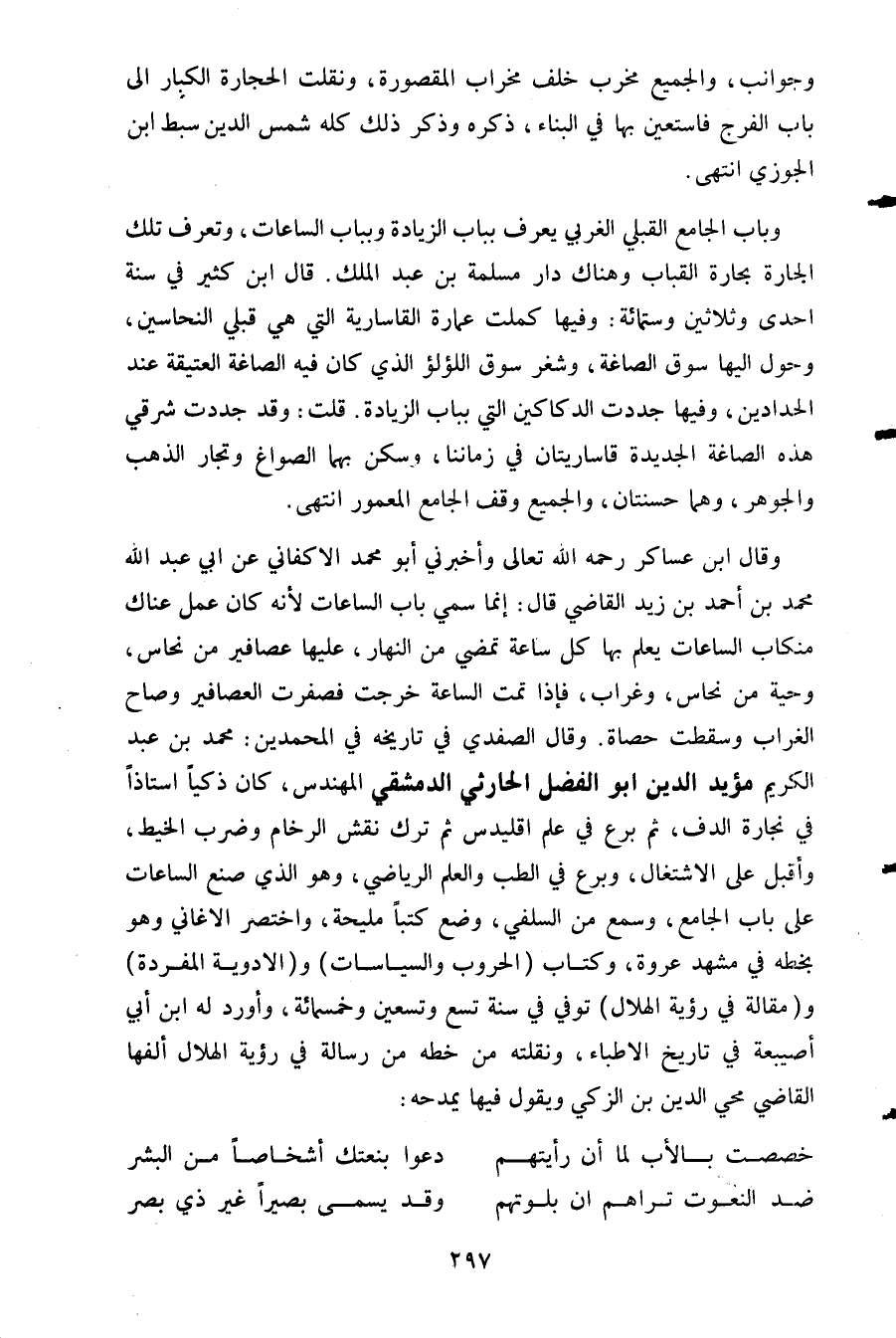 وقال ابن عساكر رحمه الله تعالى: وأخبرني أبو محمد الاكفاني عن أبي عبد الله محمد بن أحمد بن زيد القاضي قال: إنما سمي باب الساعات لأنه كان عمل عناك منكاب الساعات يعلم بها كل ساعة تمضي من النهار عليها عصافير من نحاس وحية من نحاس وغراب فإذا تمت الساعة خرجت فصفرت العصافير وصاح الغراب وسقطت حصاة. وقال الصفدي في تاريخه في المحمدين: محمد بن عبد الكريم مؤيد الدين أبو الفضل الحارثي الدمشقي المهندس كان ذكيا أستاذا في نجارة الدف ثم برع في علم اقليدس ثم ترك نقش الرخام وضرب الخيط وأقبل على الاشتغال وبرع في الطب والعلم الرياضي وهو الذي صنع الساعات على باب الجامع وسمع من السفلي وضع كتبا مليحة واختصر الأغاني وهو بخطه في مشهد عروة وكتاب "الحروب والسياسات" و "الأدوية المفردة" و "مقالة في رؤية الهلال" توفي في سنة تسع وتسعين وخمسمائة وأورد له ابن أبي اصيبعه في تارخ الأطباء ونقلته من خطه من رسالة في رؤية الهلال الفها القاضي محي الدين بن الزكي ويقول فيها يمدحه: