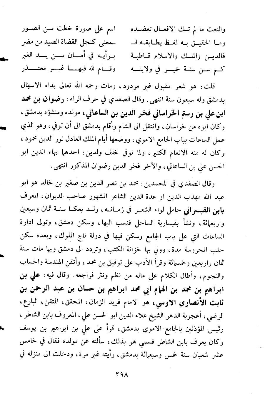 وقال الصفدي في المحمدين: محمد بن نصر الدين بن صغير بن خالد هو أبو عبد الله مهذب الدين أو عدة الدين الشاعر المشهور صاحب الديوان المعرف باب القيسراني حامل لواء الشعر في زمانه ولد بعكا سنة ثمان وسبعين وأربع مائة ونشأ بقيسارية الساحل فنسب إليها وسكن دمشق وتولى إدارة الساعات التي على باب الجامع وسكن فيها في دولة تاج الملوك وبعده سكن حلب المحروسة مدة وولي بها خزانة الكتب وتردد إلى دمشق وبها مات سنة ثمان وأربعين وخمسمائة وقرأ الأدب على توفيق بن محمد وأتقن الهندسة والحساب والنجوم وأطال الكلام على ماله من نظم ونثر فراجعه. وقال فيه: علي بن إبراهيم بن محمد بن الهمام أبي محمد إبراهيم بن حسان بن عبد الرحمن بن ثابت الأنصاري الأوسي هو الإمام فريد الزمان المحق المتقن البارع الرضي أعجوبة الدهر الشيخ علاء الدين أبو الحسن علي المعروف بابن الشاطر رئيس المؤذنين بالجامع الأموي بدمشق قرأ على علي بن إبراهيم بن يوسف وكان يعرف بابن الشاطر فسمي هو بذلك سألته عن مولده فقال في خامس عشر شعبان سنة خمس وسبعمائة بدمشق رأيته غير مرة ودخلت إلى منزله في