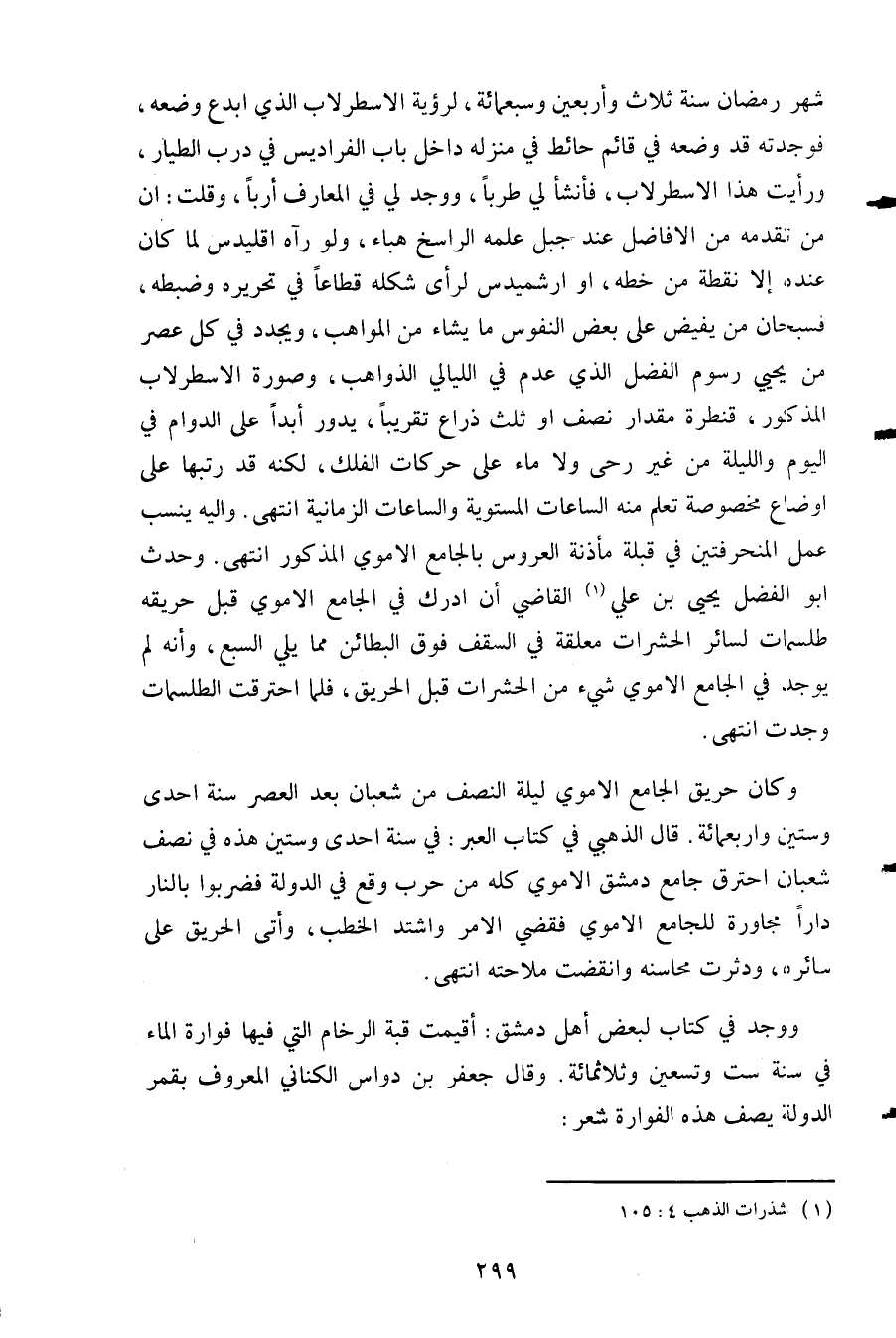 شهر رمضان سنة ثلاث وأربعين وسبعمائة لرؤية الاسطرلاب الذي أبدع وضعه فوجدته قد وضعه في قائم حائط في منزله داخل باب الفراديس في درب الطيار ورأيت هذا الاسطرلاب فأنشأ لي طربا ووجد لي في المعارف أربا وقلت: إن من تقدمه من الأفاضل عند جبل علمه الراسخ هباء ولو رآه إقليدس لما كان عنده إلا نقطة من خطه أو ارشميدس لرأى شكله قطاعا في تحرير وضبطه فسبحان من يفيض على بعض النفوس ما يشاء من المواهب ويجدد في كل عصر من يحييي رسوم الفضل الذي عدم في الليالي الذواهب وصورة الاسطرلاب المذكور قنطرة مقدار نصف أو ثلث ذراع تقريبا يدور أبدا على الدوام في اليوم والليلة من غير رحى ولا ماء على حركات الفلك لكنه قد رتبها على أوضاع مخصوصة تعلم منه الساعات المستوية والساعات الزمانية انتهى. وإليه ينسب عمل المنحرفتين في قبلة مأذنة العروس بالجامع الأموي المذكور انتهى. وحدث أبو الفضل يحيى بن علي1 القاضي أن أدرك في الجامع الأموي قبل حريقه طلسمات لسائر الحشرات معلقة في السقف فوق البطائن مما يلي السبع وأنه لم يوجد في الجامع الأموي شيء من الحشرات قبل الحريق فلما احترقت الطلسمات وجدت انتهى.