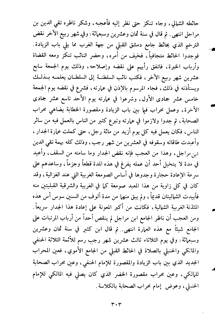 حائطه الشمالي وجاء تنكر حتى نظر إليه فأعجبه وشكر ناظره تقي الدين بن مراجل انتهى. ثم قال في سنة ثمان وعشرين وسبعمائة: وفي شهر ربيع الآخر نقض الترخيم الذي بحائط جامع دمشق القبلي من جهة الغرب مما يلي باب الزيادة. فوجدوا الحائط متجافيا فخفيف من أمره وحضر النائب تنكر ومعه القضاه وأرباب الخبرة فاتفق رأيهم على نقضه وإصلاحه وذلك يوم الجمعة سابع عشرين شهر ربيع الآخر فكتب نائب السلطنة إلى السلطان يعلمه بذلك ويستأذنه في ذلك فجاء المرسوم بالإذن في عمارته فشرع في نقضه يوم الجمعة خامس عشر جمادى الأول وشرعوا في عمارتة يوم الأحد تاسع عشر جمادى الآخرة وعمل محراب فيما بين باب الزيادة ومقصورة الخطابة يضاهي محراب الصحابة ثم جدوا ولازموا في عمارته وتبرع كثير من الناس بالعمل فيه من سائر الناس فكان يعمل فيه كل يوم أزيد من مائة رجل حتى كملت عمارة الجدار وأعيدت طاقاته وسقوفه في العشرين من شهر رجب وذلك كله بهمة تقي الدين ابن مراجل وهذا من العجب فإنه نقض الجدار وما سامته من السقف وأعيد في مدة لا يتخيل أحد أن عمله يفرغ في هذه المدة قطعا وجزما وساعدهم على سرعة الاعادة حجارة وجدوها في أساس الصومعة الغربية التي عند الغزالية وقد كان في كل زاوية من هذا المعبد صومعة كما في الغربية والشرقية القبلتين منه فأبيدت الشماليتان قديما ولم يبق منها من مدة ألوف من السنين سوس أس هذه المئذنة الغربية الشمالية فكانت من أكبر المعونة على إعادة هذا الجدار سريعا. ومن العجب أن ناظر الجامع ابن مراجل لم ينقض أحدا من أرباب المرتبات على الجامع شيئا مع هذه العمارة انتهى. ثم قال ابن كثير في سنة ثمان وعشرين وسبعمائة: وفي يوم الثلاثاء ثالث عشرين شهر رجب رسم للائمة الثلاثة الحنفي والمالكي والحنبلي بالصلاة في الحائط القبلي من الجامع الأموي فعين المحراب الجديد الذي بين باب الزيادة والمقصورة للإمام الحنفي وعين محراب الصحابة للمالكي وعين محراب مقصورة الخضر الذي كان يصلي فيه المالكي للإمام الحنبلي وعوض إمام محراب الصحابة بالكلاسة.
