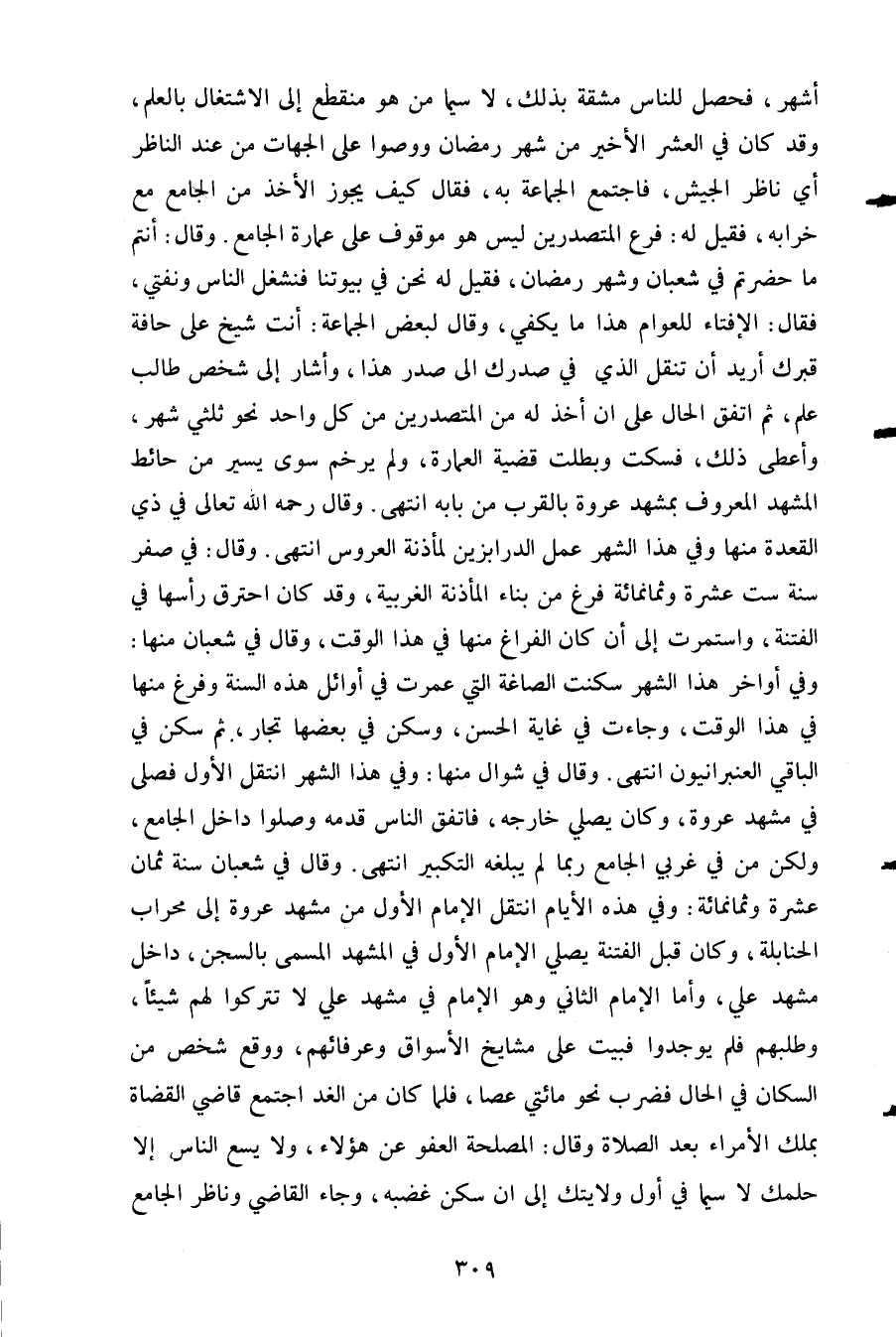أشهر فحصل للناس مشقة بذلك لا سيما من هو منقطع إلى الاشتغال بالعلم وقد كان في العشر الأخير من شهر رمضان ووصوا على الجهات من عند الناظر أي ناظر الجيش فاجتمع الجماعة به فقال: كيف يجوز الأخذ من الجامع مع خرابه فقيل له: فرع المتصدرين ليس هو موقوف على عمارة الجامع. وقال: أنتم ما حضرتم في شعبان وشهر رمضان فقيل له نحن في بيوتنا فنشغل الناس ونفتي فقال: الإفتاء للعوام هذا ما يكفي وقال لبعض الجماعة: أنت شيخ على حافة قبرك أريد أن تنقل الذي في صدرك إلى صدر هذا وأشار إلى شخص طالب علم ثم اتفق الحال على أن أخذ له من المتصدرين من كل واحد نحو ثلثي شهر وأعطى ذلك فسكت وبطلت قضية العمارة ولم يرخم سوى يسير من حائط المشهد المعروف بمشهد عروة بالقرب من بابه انتهى. وقال رحمه الله تعالى في ذي القعدة منها وفي هذا الشهر عمل الدرابزين لمأذنة العروس انتهى. وقال: في صفر سنة ست عشرة وثمانمائة فرغ من بناء المأذنة الغربية وقد كان احترق رأسها في الفتنة واستمرت إلى أن كان الفراغ منها في هذا الوقت وقال في شعبان منها: وفي أخر هذا الشهر سكنت الصاغة التى عمرت في أوائل هذه السنة وفرغ منها في هذا الوقت وجاءت في غاية الحسن وسكن في بعضها تجار ثم سكن في الباقي العنبرانيون انتهى. وقال في شوال منها: وفي هذا الشهر انتقل الأول فصلى في مشهد عروة وكان يصلي خارجه فأنفق الناس قدمه وصلوا داخل الجامع ولكن من في غربي الجامع ربما لم يبلغه التكبير انتهى. وقال في شعبان سنة ثمان عشرة وثمانمائة: وفي هذه الأيام انتقل الإمام الأول من مشهد عروة إلى محراب الحنابلة وكان قبل الفتنة يصلي الإمام الأول في المشهد المسمى بالسجن داخل مشهد علي وأما الإمام الثاني وهو الإمام في مشهد علي لا تتركوا لهم شيئا وطلبهم فلم يوجدوا فبيت على مشايخ بالأسواق وعرفائهم ووقع شخص من السكان في الحال فضرب نحو مائتي عصا فلما كان من الغد اجتمع قاضي القضاة بملك الأمراء بعد الصلاة وقال: المصلحة العفو عن هؤلاء ولا سمع الناس إلا حلمك لا سيما في أول ولايتك إلى أن سكن غضبه وجاء القاضي وناظر الجامع