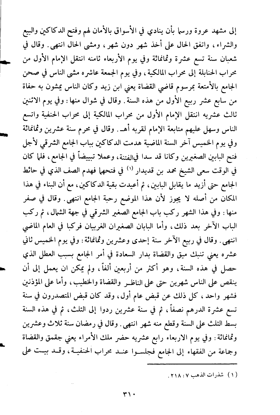 إلى مشهد عروة ورسما بأن ينادي في بالأسواق بالأمان لهم وفتح الدكاكين والبيع والشراء واتفق الحال على أخذ شهر دون شهر ومشى الحال انتهى. وقال في شعبان سنة تسع عشر وثمانمائة وفي يوم الأربعاء ثامنه انتقل الإمام الأول من محراب الحنابله إلى محراب المالكية وفي يوم الجمعة عاشره مشى الناس في صحن الجامع بالامتعة بمرسوم قاضي القضاة يعني ابن زيد وكان الناس يمشون به حفاة من سابع عشر ربيع الأول من هذه السنة. وقال في شوال منها: وفي يوم الاثنين ثالث عشرية انتقل الإمام الأول من محراب المالكية إلى محراب الحنفية واتسع الناس وسهل عليهم متابعة الإمام لقربه اهـ. وقال في محرم سنة عشرين وثمانمائة: وفي يوم الخميس آخر السنة الماضية هدمت الدكاكين بباب الجامع الشرقي لأجل فتح البابين الصغيرين وكانا قد سدا في الفتنه وعملا تبييضا في الجامع فلما كان في الوقت سعى الشيخ محمد بن قديدار1 في فتحهما فهدم الصف الذي في حائط الجامع حتى أزيد ما يقابل البابين ثم أعيدت بقية الدكاكين مع أن البناء في هذا المكان من أصله لا يجوز لأن هذا الموضع رحبة الجامع انتهى. وقال في صفر منها: وفي هذا الشهر ركب باب الجامع الصغير الشرقي في جهة الشمال ثم ركب الباب الآخر بعد ذلك وأما البابان الصغيران الغربيان فركبا في العام الماضي انتهى. وقال في ربيع الآخر سنة إحدى وعشرين وثمانمائة: وفي يوم الخميس ثاني عشره يعني تنبك ميق والقضاة بدار السعادة في أمر الجامع بسبب العطل الذي حصل في هذه السنة وهو أكثر من أربعين ألفا ولم يمكن أن يعمل إلى أن ينقص على الناس شهرين حتى على الناظر والقضاة والخطيب وأما على المؤذنين فشهر واحد كل ذلك عن قبض عام أول وقد كان قبض المتصدرون في سنة تسع عشره الدرهم نصفا ثم في سنة عشرين ردوا إلى الثلث ثم في هذه السنة بسط الثلث على السنة وقطع منه شهر انتهى. وقال في رمضان سنة ثلاث وعشرين وثمانمائة: وفي يوم الأربعاء رابع عشريه حضر ملك الأمراء يعني جمقمق والقضاة وجماعة من الفقهاء إلى الجامع فجلسوا عند محراب الحنفية وقد بيت على