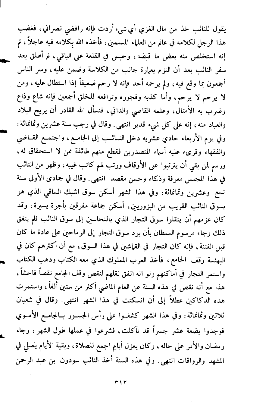يقول للنائب خذ من مال الغزي أي شئ أردت فإنه رافضي نصراني فغضب هذا الرجل لكلامه في عالم من العلماء المسلمين فأخذه الله بكلامه فيه عاجلا ثم إنه استلخص منه بعض ما قبضه وحبس في القلعة على الباقي ثم أطلق بعده سفر النائب بعد أن التزم بعمارة جانب من الكلاسة وضمن عليه وسر الناس أجمعون بما وقع فيه ولم يرحمه أحد فإنه لارحم ضعيفا إذا استطال عليه ومن لا يرحم لايرحم وأما كذبه وفجوره وترافعه للخلق أجمعين فإنه شاع وذاع وضرب به الأمثال وعلمه القاصي والداني فنسأل الله القادر أن يريح البلاد والعباد منه إنه على كل شئ قدير انتهى. وقال في رجب سنة عشرين وثمانمائة: وفي يوم الأربعاء حادي عشرية دخل النائب إلى الجامع واجتمع القاضي والفقهاء وقرىء عليه أسماء المتصدرين فقطع منهم طائفة ممن لا استحقاق له ورسم لمن بقي أن يترتبوا على الأوقاف ورتب لهم كاتب غيبة وظهر من النائب في هذا المجلس معرفة وذكاء وحسن مقصد انتهى. وقال في جمادى الأولى سنة تسع وعشرين وثمانمائة: وفي هذا الشهر أسكن سوق اشبك الساقي الذي هو بسوق النائب القريب من البزوريين أسكن جماعة مفرقين بأجرة يسيره وقد كان عزمهم أن ينقلوا سوق التجار الذي بالنحاسين إلى سوق النائب فلم يتفق ذلك وجاء مرسوم السلطان بأن يرد سوق التجار إلى الرماحين على عادة ما كان قبل الفتنه فإنه كان التجار في القماشين في هذا السوق مع أن أكثرهم كان في البهنسة وقف الجامع فأخذ العرب المملوك الذي معه الكتاب وذهب الكتاب واستمر التجار في أماكنهم ولو أنه اتفق نقلهم لنقص وقف الجامع نقصا فاحشا هذا مع أنه نقص في هذه السنة عن العام الماضي أكثر من ستين ألفا واستمرت هذه الدكاكين عطلا إلى أن انسكنت في هذا الشهر انتهى. وقال في شعبان ثلاثين وثمانمائة: وفي هذا الشهر كشفوا على رأس الجسور بالجامع الأموي فوجدوا بضعة عشرة جسرا قد تآكلت فشرعوا في عملها طول الشهر وجاء رمضان والأمر على حاله وكان يعزل أيام الجمع للصلاة وبقية الأيام يصلي في المشهد والرواقات انتهى. وفي هذه السنة أخذ النائب سودون بن عبد الرحمن