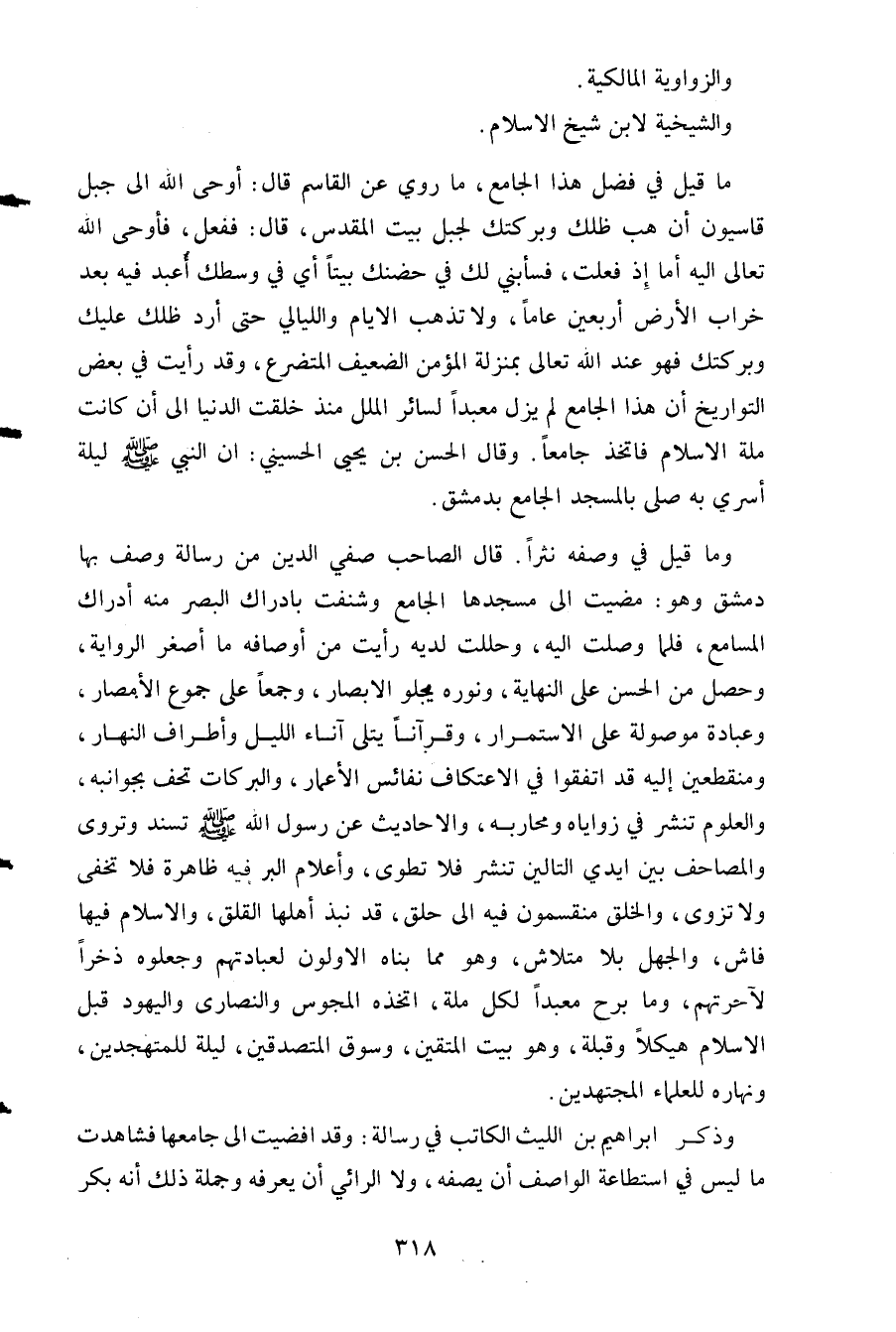 وما قيل في وصفه نثرا. قال الصاحب صفي الدين من رسالة وصف بها دمشق وهو: مضيت إلى مسجدها الجامع وشنفت بإدراك البصر منه إدراك المسامع فلما وصلت إليه وحللت لديه رأيت من أوصافه ما أصغر الرواية وحصل من الحسن على النهاية ونوره يجلو الابصار وجمعا على الجموع الامصار وعبادة موصولة على الاستمرار وقرآنا يتلى آناء الليل وأطراف النهار ومنقطعين إليه قد اتفقوا في الاعتكاف نفائس الأعمار والبركات تحف بجوانية والعلوم تنشر في زواياه ومحارية والأحاديث عن رسول الله صَلَّى اللَّهُ عَلَيْهِ وَسَلَّمَ تسند وتروى والمصاحف بين أيدي التالين تنشر فلا تطوى وأعلام البر فيه ظاهرة فلا تخفى ولا تزوى والخلق منقسمون فيه إلى حلق قد نبذ أهلها القلق والإسلام فيها فاش والجهل بلا متلاش وهو مما بناه الأولون لعبادتهم وجعلوه ذخرا لآخرتهم وما برح معبدا لكل ملة اتخذه المجوس والنصارى واليهود قبل الإسلام هيكلا وقبلة وهو بيت المتقين وسوق المتصدقين ليلة للمتهجدين ونهاره للعلماء المجتهدين.
