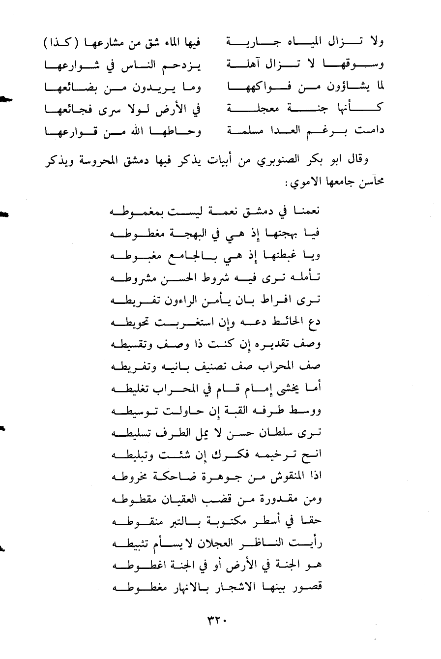 وقال أبو بكر الصنبوري من أبيات يذكر فيها دمشق المحروسة ويذكر محاسن جامعها الأموي:
