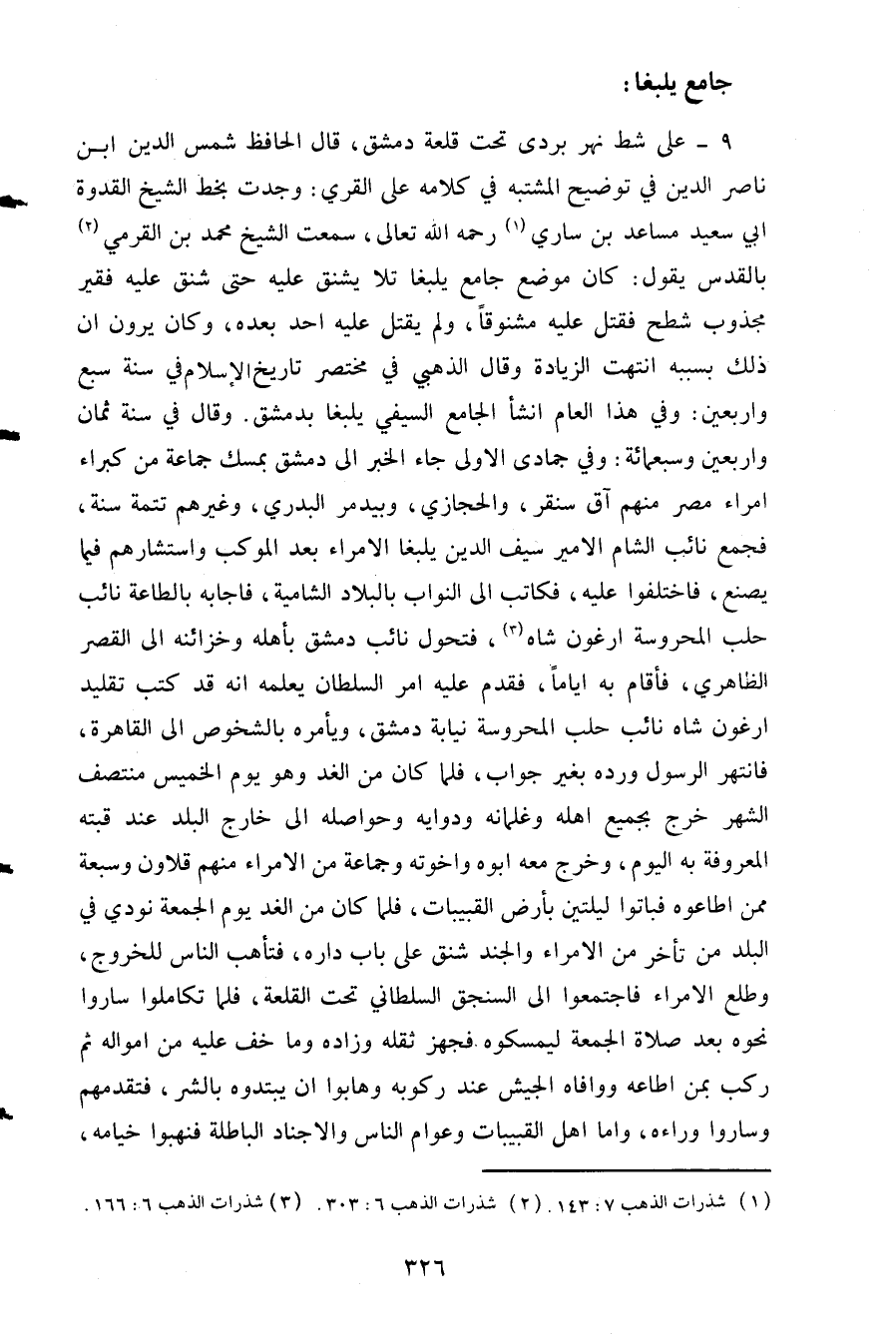 9- على شط نهر بردى تحت قلعة دمشق قال الحافظ شمس الدين ابن ناصر الدين في توضيح المشتبه في كلامه على القري: وجدت بخط الشيخ القدوة أبي سعيد مساعد بن ساري1 رحمه الله تعالى سمعت الشيخ محمد بن القرمي2 بالقدس يقول: كان موضع جامع يلبغا تلا يشنق عليه حتى شنق عليه فقير مجذوب شطح فقتل عليه مشنوقا ولم يقتل عليه أحد بعده وكان يرون أن ذلك بسببه انتهت الزيادة. وقال الذهبي في مختصر تاريخ الإسلام في سنة سبع وأربعين: وفي هذا العام أنشأ الجامع السيفي يلبغا بدمشق. وقال في سنة ثمان وأربعين وسبعمائة: وفي جمادى الأولى جاء الخبر إلى دمشق بمسك جماعة من كبراء أمراء مصر منهم آق سنقر والحجازي وبيدمر البدري وغيرهم تتمه سنة فجمع نائب الشام الأمير سيف الدين يلبغا الأمراء بعد الموكب واستشارهم فيما يصنع فاختلفوا عليه فكاتب إلى النواب بالبلاد الشامية فأجابه بالطاعة نائب حلب المحروسة ارغون شاه3 فتحول نائب دمشق بأهله وخزائنه إلى القصر الظاهري فأقام به أياما فقدم عليه أمر السلطان يعلمه أنه قد كتب تقليد ارغون شاه نائب حلب المحروسة نيابة دمشق ويأمره بالشخوص إلى القاهرة فانتهر الرسول ورده بغير جواب فلما كان من الغد وهو يوم الخميس منتصف الشهر خرج بجميع أهله وغلمانه ودوايه وحواصله إلى خارج البلد عند قبته المعروفة به اليوم وخرج معه أبوه وإخوته وجماعة من الأمراء منهم قلاون وسبعة ممن أطاعوه فباتوا ليلتين بأرض القبيبات فلما كان من الغد يوم الجمعة نودي في البلد من تأخر من الأمراء والجند شنق على باب داره فتأهب الناس للخروج وطلع الأمراء فاجتمعوا إلى السنجق السلطاني تحت القلعة فلما تكاملوا ساروا نحوه بعد صلاة الجمعة ليمسكوه فجهز ثقله وزاده وما خف عليه من أمواله ثم ركب بمن أطاعه ووافاه الجيش عند ركوبه وهابوا أن يبتدوه بالشر فتقدمهم وساروا وراءه وأما أهل القبيبات وعوام الناس والأجناد الباطله فنهبوا خيامه