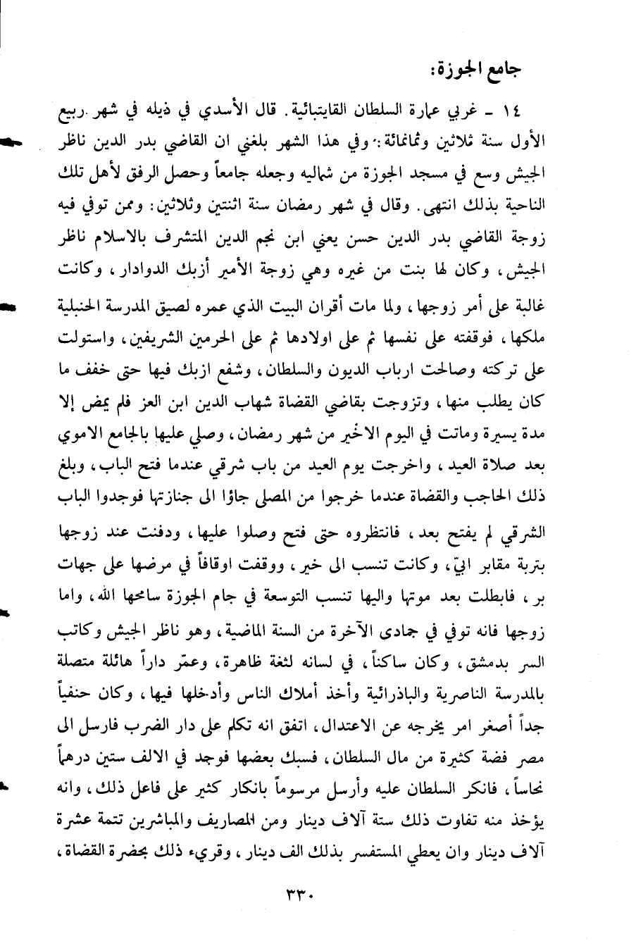 14- غربي عمارة السلطان القايتبائية. قال الأسدي في ذيله في شهر ربيع الأول سنة ثلاثين وثمانمائة: وفي هذا الشهر بلغني أن القاضي بدر الدين ناظر الجيش وسع في مسجد الجوزة من شمالية وجعله جامعا وحصل الرفق لأهل تلك الناحية بذلك انتهى. وقال في شهر رمضان سنة اثنتين وثلاثين: وممن توفي فيه زوجة القاضي بدر الدين حسن يعني ابن نجم الدين المتشرف بالاسلام ناظر الجيش وكان لها بنت من غيره وهي زوجة الأمير أزبك الدوادار وكانت غالبة على أمر زوجها ولما مات أقران البيت الذي عمره لصيق المدرسة الحنبلية ملكها فوقفته على نفسها ثم على أولادها ثم على الحرمين الشريفين واستولت على تركته وصالحت أرباب الديون والسلطان وشفع أزبك فيها حتى خفف ما كان يطلب منها وتزوجت بقاضي القضاة شهاب الدين ابن العز فلم يمض إلا مدة يسيرة وماتت في اليوم الأخير من شهر رمضان وصلي عليها بالجامع الأموي بعد صلاة العيد وأخرجت يوم العيد من باب شرقي عندما فتح الباب وبلغ ذلك الحاجب والقضاة عندما خرجوا من المصلى جاؤا إلى جنازتها فوجدوا الباب الشرقي لم يفتح بعد فانتظروه حتى فتح وصلوا عليها ودفنت عند زوجها بتربة مقابر أبي وكانت تنسب إلى خير ووقف أوقافا في مرضها على جهات بر فأبطلت بعد موتها وإليها تنسب التوسعة في جام الجوزة سامحها الله وأما زوجها فإنه توفي في جمادى الآخرة من السنة الماضية وهو ناظر الجيش وكاتب السر بدمشق وكان ساكنا في لس أنه لثغة ظاهرة وعمر دارا هائلة متصلة بالمدرسة الناصرية والباذرائية وأخذ أملاك الناس وأدخلها فيها وكان حنيفا جدا أصغر أمر يخرجه عن الاعتدال اتفق أنه تكلم على دار الضرب فأرسل إلى مصر فضة كثيره من مال السلطان فسبك بعضها فوجد في الألف ستين درهما نحاسا فأنكر السلطان عليه وأرسل مرسوما بإنكار كثير على فاعل ذلك وأنه يؤخذ منه تفاوت ذلك ستة الآف دينار ومن المصاريف والمباشرين تتمة عشرة الآف دينار وإن يعطي المستفسر بذلك ألف دينار وقريء ذلك بحضرة القضاة
