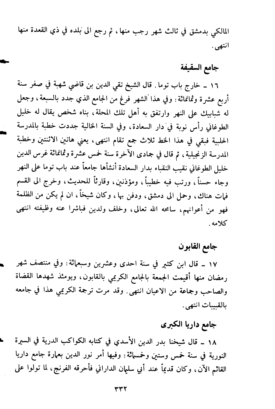 18- قال شيخنا بدرالدين الأسدي في كتابه الكواكب الدرية في السيرة النورية في سنة خمس وستين وخمسمائة: وفيها أمر نور الدين بعمارة جامع داريا القائم الآن وكان قديما عند أبي سليمان الداراني فأحرقه الفرنج لما تولوا على