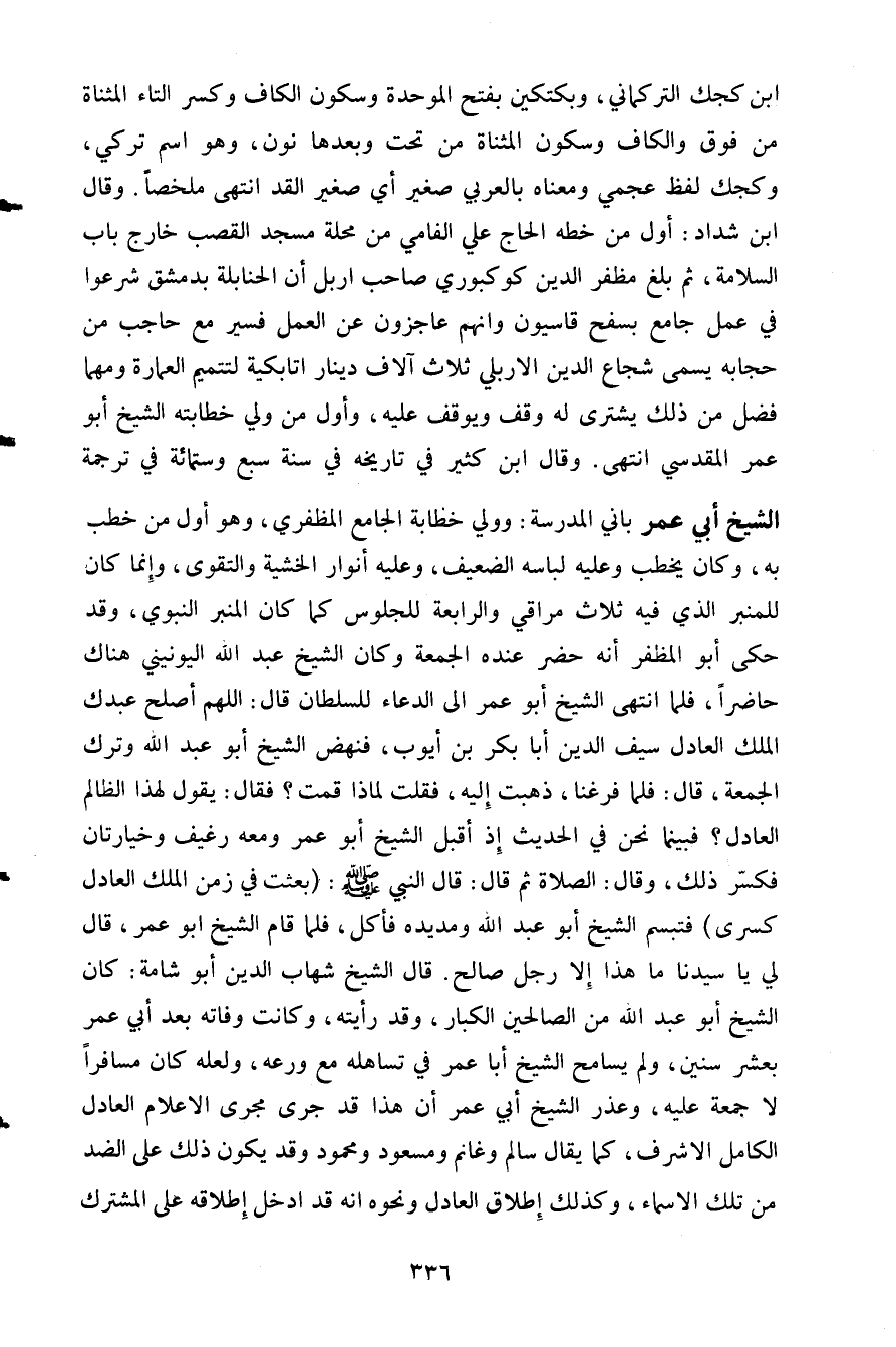 ابن كجك التركماني وبكتكين بفتح الموحدة وسكون الكاف وكسر التاء المثناة من فوق الكاف وسكون مثناة من تحت وبعدها نون وهو اسم تركي وكجك لفظ عجمي ومعناه بالعربي صغير أي صغير لقد انتهى. ملخصا وقال ابن شداد: أول من خط الحاج علي الفامي من محلة مسجد القصب خارج باب السلامة ثم بلغ مظفر الدين كوكنبوري صاحب إربل أن الحنابلة بدمشق شرعوا في عمل جامع بسفح قاسيون وأنهم عاجزون عن العمل فيسير مع حاجب من حجابه يسمى شجاع الدين الإربلي ثلاثة الآف دينار أتابكية للتتميم العمارة ومهما فضل من ذلك يشتري له وقف ويوقف عليه وأول من ولي خطابته الشيخ أبو عمر المقدسي انتهى. وقال ابن كثير في تاريخه في سنة سبع وستمائة في ترجمة الشيخ أبي عمر باني المدرسة وولي خطابة الجامع المظفري وهو أول من خطب به وكان يخطب وعليه لباسه الضعيف وعليه أنوار الخشية والتقوى وإنما كان للمنبر الذي فيه ثلاث مراقي وأربعة للجلوس كما كان المنبر النبوي قد حكى أبو مظفر أنه حضر عنده الجمعة وكان شيخ عبد الله اليونيني هناك حاضره فلما انتهى. الشيخ أبو عمر إلى الدعاء إلى السلطان قال: اللهم أصلح عبدك الملك العادل سيف الدين أبا بكر بن أيوب فنهض الشيخ أبو عبد الله وترك الجمعة قال: فلما فرغنا ذهبت إليه فقلت: لماذا قمت؟ فقال: يقول لهذا الظالم العادل؟ وبينما نحن في الحديث إذ أقبل الشبيخ أبو عمر ومعه رغيف وخيارتان فكسر ذلك وقال: الصلاة ثم قال: قال النبي صَلَّى اللَّهُ عَلَيْهِ وَسَلَّمَ: "بعثت في زمن الملك العادل كسرى" فتبسم الشيخ أبو عبد الله ومد يده فأكل فلما قام الشيخ أبو عمر قال: لي يا سيدنا ما هذا إلا رجل صالح قال الشيخ شهاب الدين أبو شامه: كان الشيخ أبو عبد الله من الصالحين الكبار وقد رأيته وكانت وفاته بعد أبي عمر بعشرة سنين ولم يسامح الشيخ أبي عمر في تساهله مع ورعه ولعه كان مسافرا لا جمعة عليه وعذر الشيخ أبي عمر أن هذا قد جرى مجرى الأعلام العادل الكامل الأشرف كما يقال سالم وغانم ومسعود ومحمود وقد يكون ذلك على الضد من تلك الأسماء وكذلك إطلاق العادل ونحوه أنه قد أدخل إطلاقه على المشترك