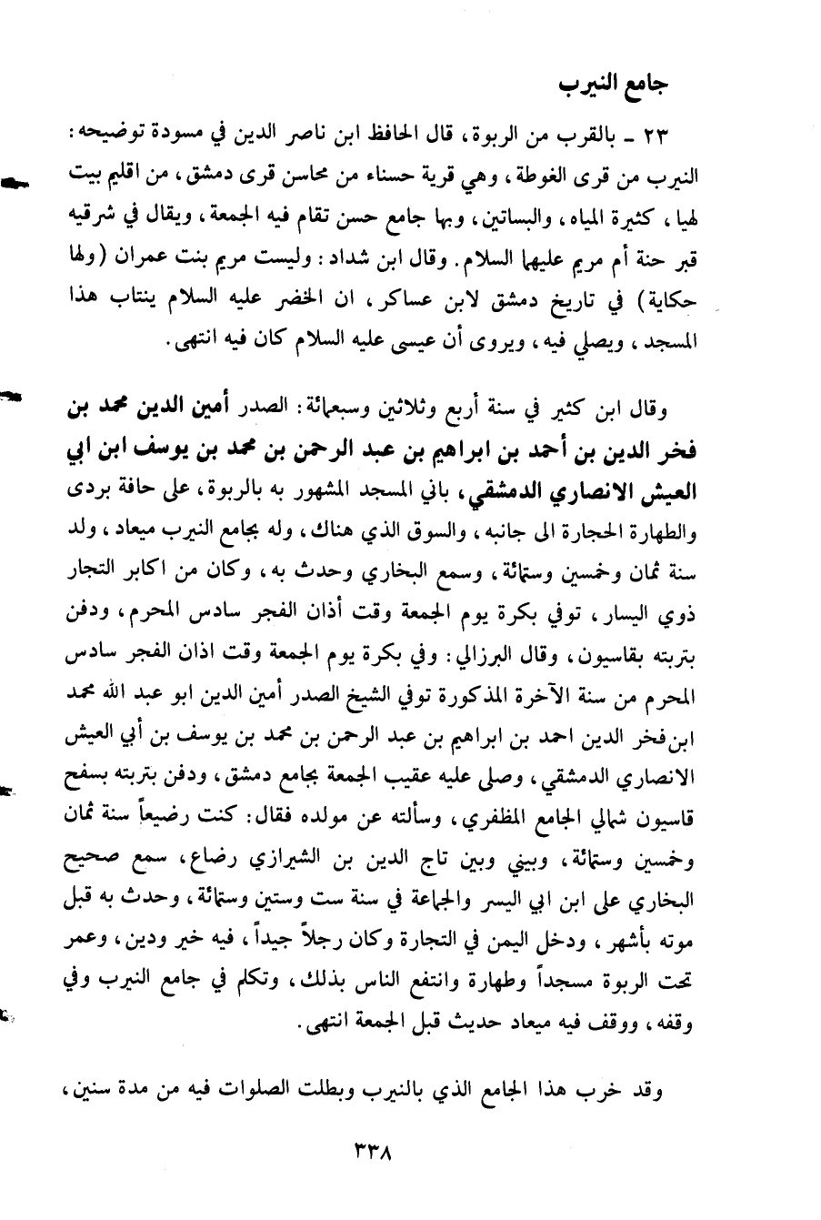 23- بالقرب من الربوة قال الحافظ ابن ناصر الدين في مسودة توضيحه: النيرب من قرى الغوطة وهي قرية حسناء من محاسن قرى دمشق من إقليم بيت لهيا كثيرة المياه والبساتين وبها جامع حسن تقام فيه الجمعة ويقال في شرقيه قبر حنة أم مريم عليهما السلام. وقال ابن شداد: وليست مريم بنت عمران "ولها حكاية" في تاريخ دمشق لابن عساكر أن الخضر عليه السلام ينتاب هذا المسجد ويصلي فيه ويروي أن عيسى عليه السلام كان فيه انتهى.