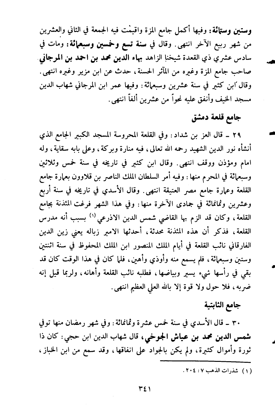 وستين وستمائة: وفيها أكمل جامع المزة وأقيمت فيه الجمعة في الثاني والعشرين من شهر ربيع الآخر انتهى. وقال في سنة تسع وخمسين وسبعمائة ومات في سادس عشري ذي القعدة شيخنا الزاهد بهاء الدين محمد بن أحمد بن المرجاني صاحب جامع المزة وغيره من الماثر الحسنة حدث عن ابن مزير وغيره انتهى. وقال ابن كثير في سنة عشرين وسبعمائة: وفيها عمر ابن المرجاني شهاب الدين مسجد الخيف وأنفق عليه نحوا من عشرين ألفا انتهى.