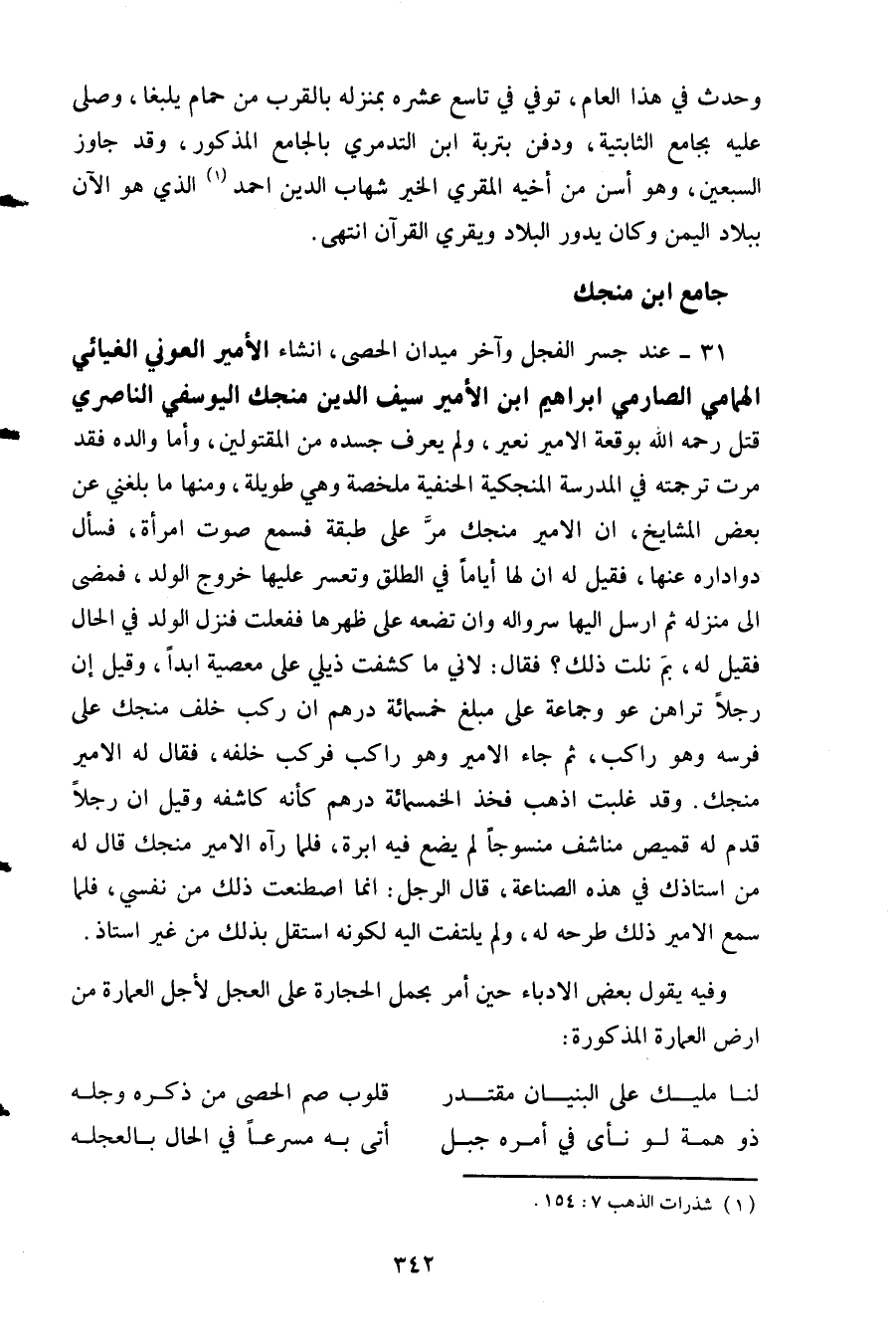 31- عند جسر الفجل وآخر ميدان الحصى أنشأ الأمير العوني الغيائي الهمامي الصارمي إبراهيم ابن الأمير سيف الدين منجك اليوسفي الناصري قتل رحمه الله بوقعة الأمير نعير ولم يعرف جسده من المقتولين وأما والده فقد مرت ترجمته في المدرسة المنجكية الحنفية ملخصة وهي طويلة ومنها ما بلغني عن بعض المشايخ أن الأمير منجك مر على طبقة فسمع صوت أمراه فسأله دواداره عنها فقيل له إن لها أياما في الطلق وتعسر عليها خروج الولد فمضى إلى منزله ثم أرسل إليها سرواله وأن تضعه على ظهرها ففعلت فنزل الولد في الحال فقيل له بم نلت ذلك؟ فقال: لأني ما كشفت ذيلي على معصية أبدا وقيل إن رجل تراهن هو وجماعة على مبلغ خمسمائة درهم إن ركب خلف منجك على فرسه وهو راكب ثم جاء الأمير وهو راكب فركب خلفه فقال له الأمير منجك. وقد غلبت اذهب فخذ الخمسمائة درهم كأنه كاشفه وقيل إن رجلا قدم له قميص مناشف منسوجا لن يضع فيه إبره فلما رآه الأمير منجك قال له من أستاذك في هذا الصناعة قال الرجل: إنما اصطنعت ذلك من نفسي فلما سمع الأمير ذلك طرحه له ولم يلتفت إليه لكونه استقل بذلك من غير أستاذ