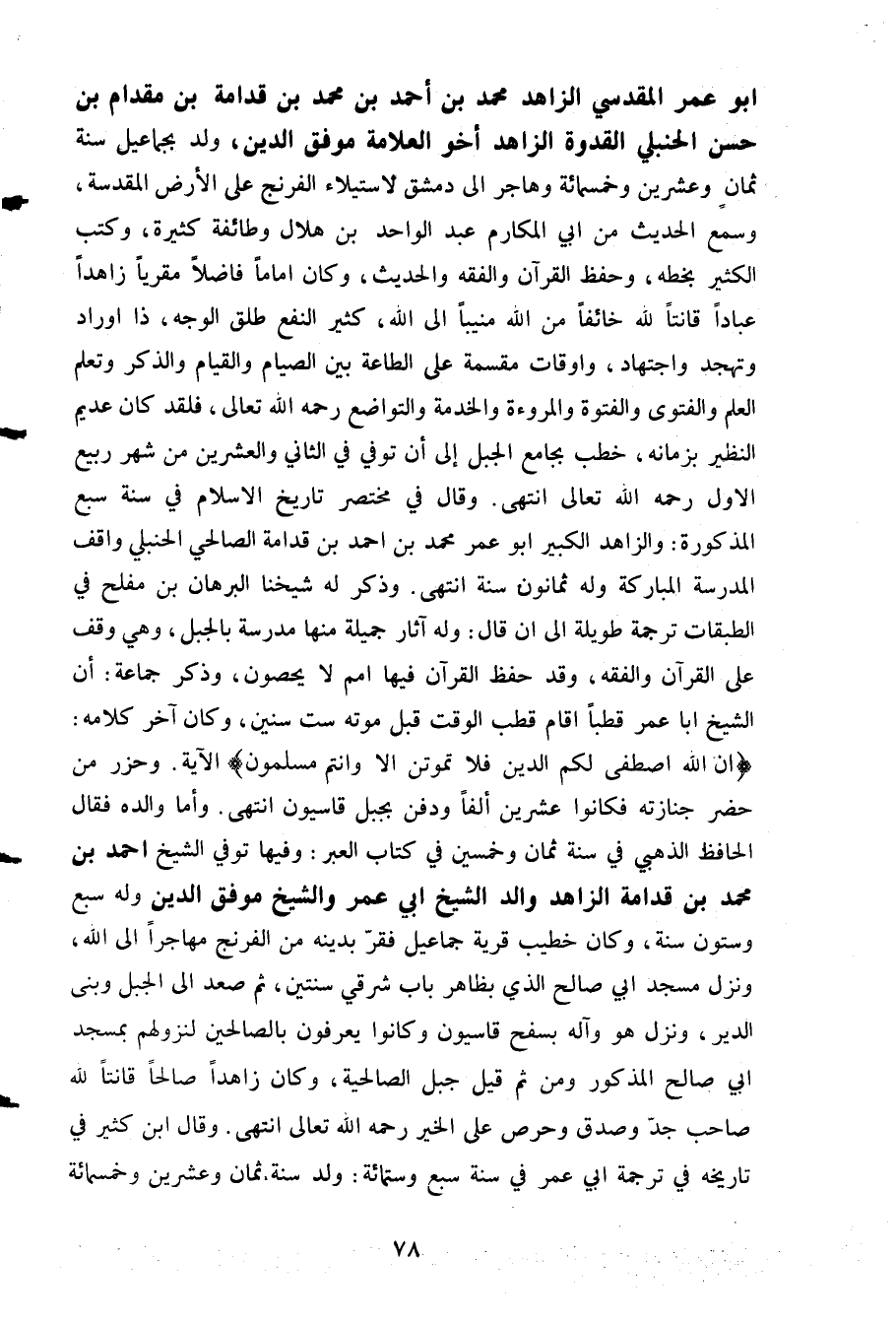أبو عمر المقدسي الزاهد محمد بن أحمد بن محمد بن قدامة بن مقدام بن حسن الحنبلي القدوة الزاهد أخو العلامة موفق الدين ولد بجماعيل سنة ثمان وعشرين وخمسمائة وهاجر إلى دمشق لاستيلاء الفرنج على الأرض المقدسة وسمع الحديث من أبي المكارم عبد الواحد بن هلال وطائفة كثيرة وكتب الكثير بخطه وحفظ القرآن والفقه والحديث وكان إماما فاضلا مقريا زاهدا عبادا قانتا لله خائفا من الله منيبا إلى الله كثير النفع طلق الوجه ذا أوراد وتهجد واجتهاد وأوقات مقسمة على الطاعة بين الصيام والقيام والذكر وتعلم العلم والفتوى والفتوة والمروءة والخدمة والتواضع رحمه الله تعالى فلقد كان عديم النظير بزمانه خطب بجامع الجبل إلى أن توفي في الثاني والعشرين من شهر ربيع الأول رحمه الله تعالى انتهى. وقال في مختصر تاريخ الإسلام في سنة سبع المذكورة والزاهد الكبير أبو عمر محمد بن أحمد بن قدامة الصالحي الحنبلي واقف المدرسة المباركة وله ثمانون سنة انتهى. وذكر له شيخنا البرهان بن مفلح في الطبقات ترجمة طويلة إلى أن قال: وله آثار جميلة منها مدرسة بالجبل وهي وقف على القرآن والفقه وقد حفظ القرآن فيها أمم لا يحصون وذكر جماعة أن الشيخ أبا عمر قطبا أقام قطب الوقت قبل موته ست سنين وكان آخر كلامه {إِنَّ اللَّهَ اصْطَفَى لَكُمُ الدِّينَ فَلا تَمُوتُنَّ إلا وأنتمْ مُسْلِمُونَ} الآية. وحرز من حضر جنازته فكانوا عشرين ألفا ودفن بجبل قاسيون انتهى. وأما والده فقال الحافظ الذهبي في سنة ثمان وخمسين في كتاب العبر: وفيها توفي الشيخ أحمد بن محمد بن قدامة الزاهد والد الشيخ أبي عمر والشيخ موفق الدين وله سبع وستون سنة وكان خطيب قرية جماعيل ففر بدينه من الفرنج مهاجرا إلى الله ونزل مسجد أبي صالح الذي بظاهر باب شرقي سنتين ثم صعد إلى الجبل وبنى الدير ونزل هو وآله بسفح قاسيون وكانوا يعرفون بالصالحين لنزولهم بمسجد أبي صالح المذكور ومن ثم قيل جبل الصالحية وكان زاهدا صالحا قانتا لله صاحب جد وصدق وحرص على الخير رحمه الله تعالى انتهى. وقال ابن كثير في تاريخه في ترجمة أبي عمر في سنة سبع وستمائة: ولد سنة ثمان وعشرين وخمسمائة