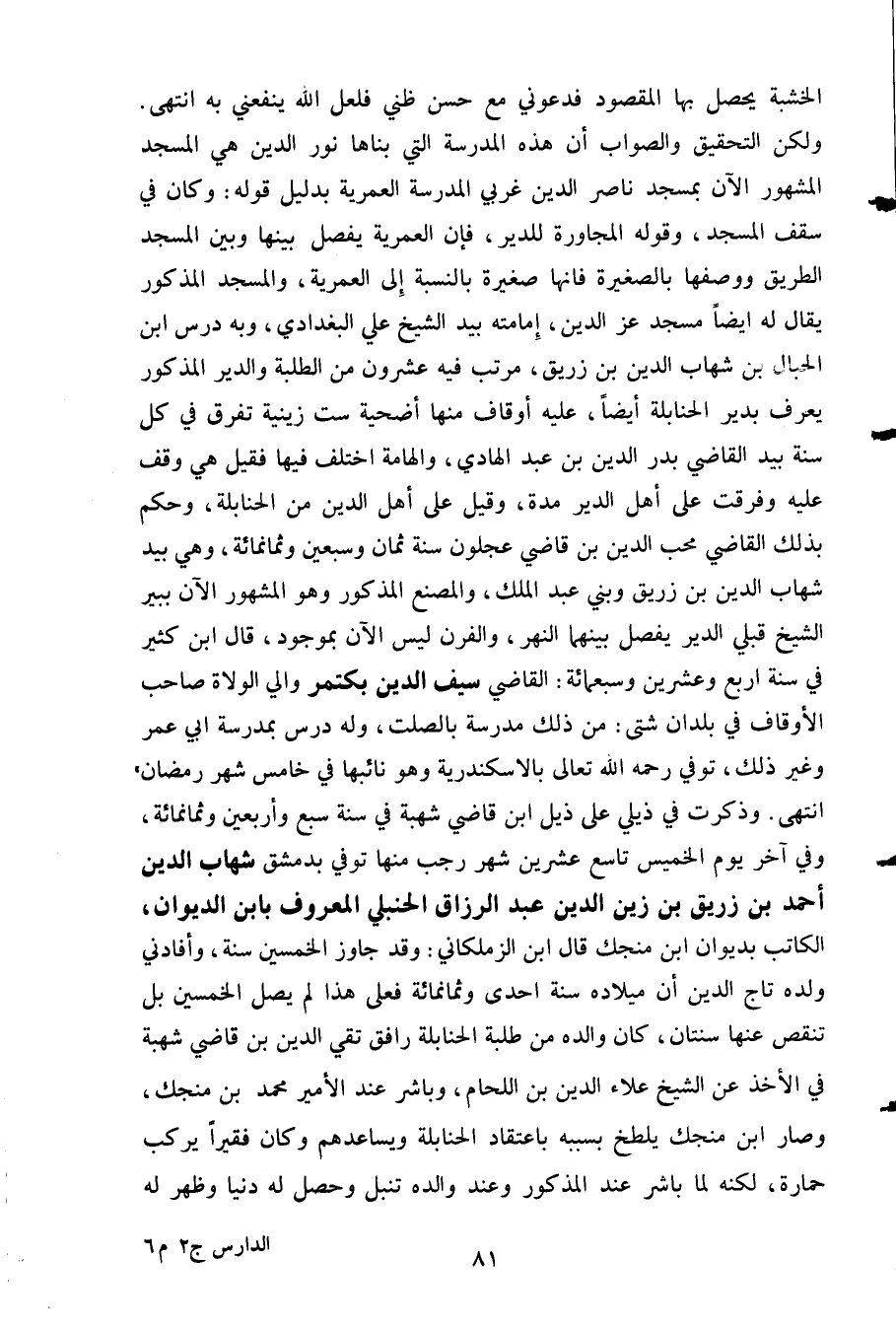 الخشبة يحصل بها المقصود فدعوني مع حسن ظني فلعل الله ينفعني به انتهى. ولكن التحقيق والصواب أن هذه المدرسة التي بناها نور الدين هي المسجد المشهور الآن بمسجد ناصر الدين غربي المدرسة العمرية بدليل قوله: وكان في سقف المسجد وقوله المجاورة للدير فان العمرية بفصل بينها وبين المسجد الطريق ووصفها بالصغيرة فإنه اصغيرة بالنسبة إلى العمرية والمسجد المذكور يقال له أيضا: مسجد عز الدين إمامته بيد الشيخ علي البغدادي وبه درس ابن الحبال بن شهاب الدين بن زريق مرتب فيه عشرون من الطلبة والدير المذكور يعرف بدير الحنابلة أيضا عليه أوقاف منها أضحية ست زينيه تفرق في كل سنة بيد القاضي بدر الدين بن عبد الهادي والهامه أختلف فيها فقيل هي وقف عليه وفرقت على أهل الدير مدة وقيل على أهل الدين من الحنابلة وحكم بذلك القاضي محب الدين بن قاضي عجلون سنة ثمان وسبعين وثمانمائة وهي بيد شهاب الدين بن زريق وبني عبد الملك والمصنع المذكور وهو المشهور الآن ببير الشيخ قبلي الدير يفصل بينهما النهر والفرن ليس الآن بموجود قال ابن كثير في سنة أربع وعشرين وسبعمائة: القاضي سيف الدين بكتمر والي الولاة صاحب الأوقاف في بلدان شتى من ذلك مدرسة بالصلت وله درس بمدرسة أبي عمر وغير ذلك توفي رحمه الله تعالى بالأسكندرية وهو نائبها في خامس شهر رمضان انتهى. وذكرت في ذيل على ذيل ابن قاضي شهبة في سنة سبع وأربعين وثمانمائة: وفي آخر يوم الخميس تاسع عشرين شهر رجب منها توفي بدمشق شهاب الدين أحمد بن زريق بن زين الدين عبد الرازق الحنبلي المعروف بابن الديوان الكاتب بديوان ابن منجك قال ابن الزملكاني: وقد جاوز الخمسين سنة وأفادني ولده تاج الدين أن ميلاده سنة إحدى وثمانمائة فعلى هذا لم يصل الخمسين بل تنقص عنها سنتان كان والده من طلبة الحنابلة رافق تقي الدين بن قاضي شهبة في الأخذ عن الشيخ علاء الدين بن اللحام وباشر عند الأمير محمد بن منجك وصار ابن منجك يلطخ بسببه باعتقاد الحنابلة ويساعدهم وكان فقيرا يركب حمارة لكنه لما باشر عند المذكور وعند والده تنبل وحصل له دنيا وظهر له