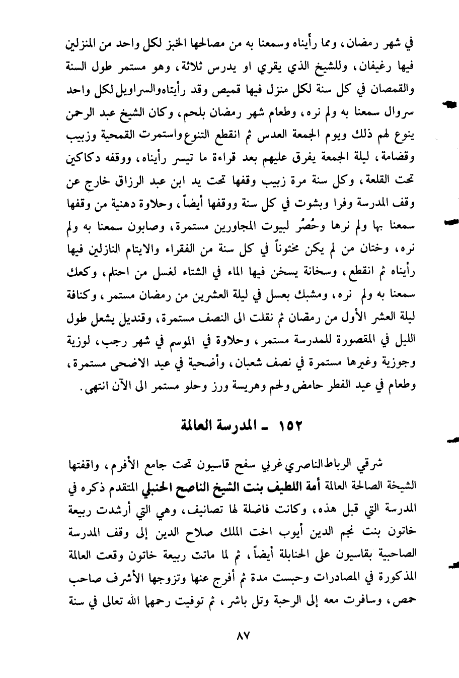 في شهر رمضان ومما رأيناه وسمعنا به من مصالحها الخبز لكل واحد من المنزلين فيها رغيفان وللشيخ الذي يقري أو يدرس ثلاثة وهو مستمر طول السنة والقمصان في كل سنة لكل منزل فيها قميص وقد رأيتاه والسراويل لكل واحد سروال سمعنا به ولم نره وطعام شهر رمضان بلحم وكان الشيخ عبد الرحمن ينوع لهم ذلك ويوم الجمعة العدس ثم انقطع تنوع واستمرت القمحية وزبيب وقضامة ليلة الجمعة يفرق عليهم بعد قراءة ما تيسر رأيناه ووقفه دكاكين تحت القلعة وكل سنة مرة زبيب وقفها تحت يد ابن عبد الرزاق خارج عن وقف المدرسة وفرا وبشوت في كل سنة وقفها أيضا وحلاوة دهنية من وقفها سمعنا بها ولم نرها وحصر لبيوت المجاورين مستمرة وصابون سمعنا به ولم نره وختان من لم يكن مختونا في كل سنة من الفقراء والأيتام النازلين فيها رأيناه ثم انقطع وسخانة يسخن فيها الماء في الشتاء لغسل من احتلم وكعك سمعنا به ولم نره ومشبك بعسل في ليلة العشرين من رمضان مستمر وكنافة ليلة العشر الأول من رمضان ثم نقلت إلى النصف مستمرة وقنديل يشعل طول الليل في المقصورة للمدرسة مستمر وحلاوة في الموسم في شهر رجب لوزية وجوزية وغيرها مستمرة في نصف شعبان وأضحية في عيد الأضحى مستمرة وطعام في عيد الفطر حامض ولحم وهريسة ورز وحلو مستمر إلى الآن انتهى.