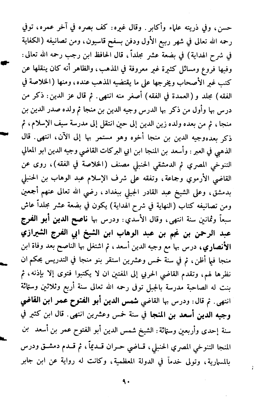 حسن وفي ذريته علماء وأكابر. وقال غيره: كف بصره في آخر عمره توفي رحمه الله تعالى في شهر ربيع الأول ودفن بسفح قاسيون ومن تصانيفه "الكفاية في شرح الهداية" في بضعة عشر مجلدا قال الحافظ ابن رجب رحمه الله تعالى: وفيها فروع ومسائل كثيرة غير معروفة في المذهب والظاهر أنه كان ينقلها عن كتب غير الأصحاب ويخرجها على ما يقتضيه المذهب عنده ومنها "الخلاصة في الفقه" مجلد و "العمدة في الفقه" أصغر منه انتهى. ثم قال عز الدين: ذكر من درس بها وأول من ذكر بها الدرس وجيه الدين بن منجا ثم ولده صدر الدين بن منجا ثم من بعده زين الدين إلى حين انتقل إلى مدرسة سيف الإسلام ثم ذكر بعده وجيه الدين بن منجا أخوه وهو مستمر بها إلى الآن انتهى. قال الذهبي في العبر وأسعد بن المنجا ابن أبي البركات القاضي وجيه الدين أبو المعالي التنوخي المصري ثم الدمشقي الحنبلي مصنف "الخلاصة في الفقه" روى عن القاضي الأرموي وجماعة وتفقه على شرف الإسلام عبد الوهاب بن الحنبلي بدمشق وعلي الشيخ عبد القادر الجيلي ببغداد رضي الله تعالى عنهم أجمعين ومن تصانيفه كتاب النهاية في شرح الهداية يكون في بضعة عشر مجلدا عاش سبعا وثمانين سنة انتهى. وقال الأسدي: ودرس بها ناصح الدين أبو الفرج عبد الرحمن ابن نجم ابن عبد الوهاب ابن الشيخ أبي الفرج الشيرازي الأنصاري درس بها مع وجيه الدين أسعد ثم اشتغل بها الناصح بعد وفاة ابن منجا فيما أظن ثم في سنة خمس وعشرين استقر بنو منجا في التدريس بحكم أن نظرها لهم وتقدم القاضي الحربي إلى المفتين أن لا يكتبوا فتوى إلا بإذنه ثم بنت له الصاحبة مدرسة بالجبل توفي رحمه الله تعالى سنة أربع وثلاثين وستمائة انتهى. ثم قال: ودرس بها القاضي شمس الدين أبو الفتوح عمر ابن القاضي وجيه الدين أسعد بن المنجا في سنة خمس وعشرين انتهى. قال ابن كثير في سنة إحدى وأربعين وستمائة: الشيخ شمس الدين أبو الفتوح عمر بن أسعد بن المنجا التنوخي المصري الحنبلي قاضي حران قديما ثم قدم دمشق ودرس بالمسمارية وتولى خدما في الدولة المعظمية وكانت له رواية عن ابن جابر