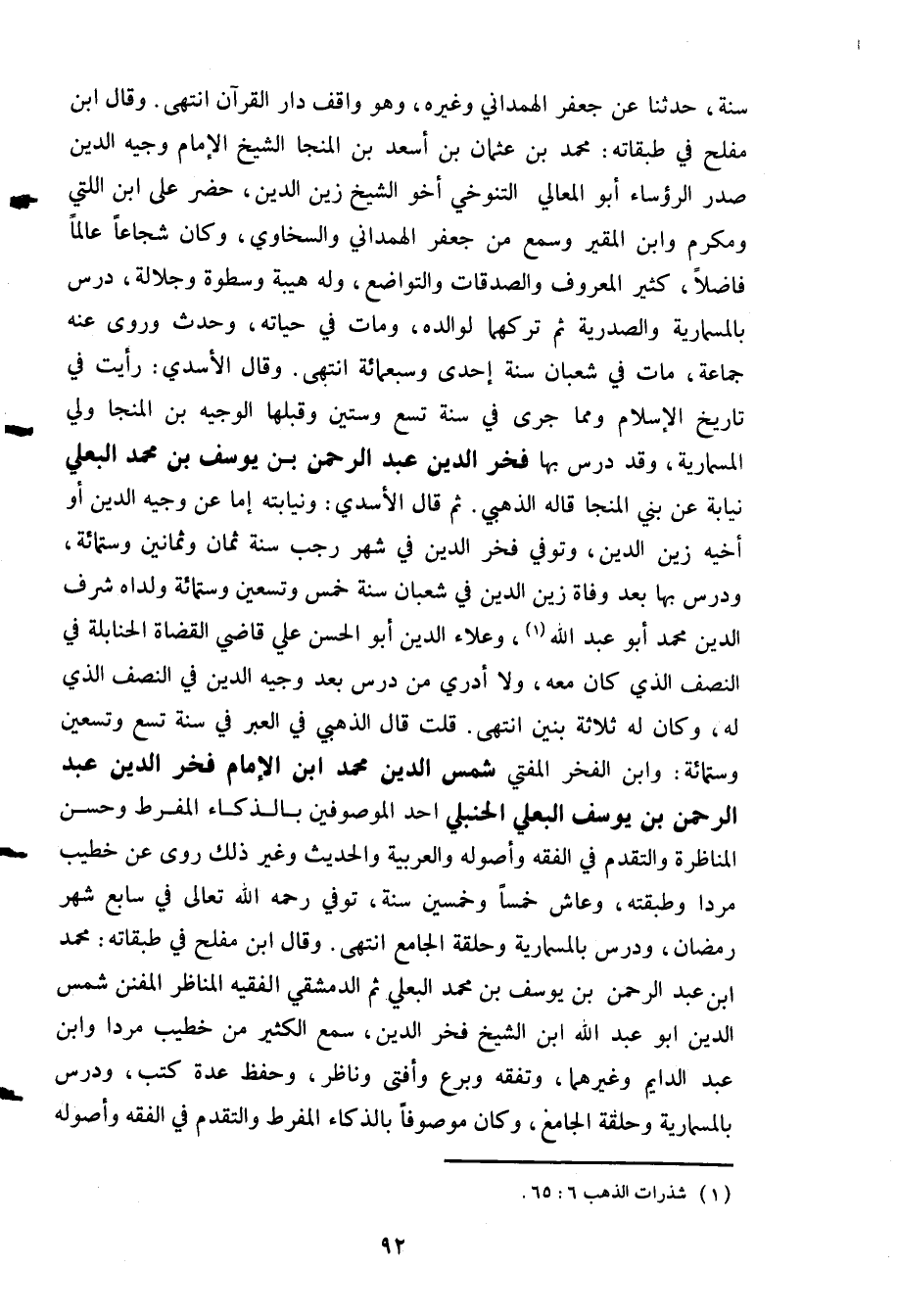 سنة حدثنا عن جعفر الهمداني وغيره وهو واقف دار القرآن انتهى. وقال ابن مفلح في طبقاته محمد بن عثمان بن أسعد ابن المنجا الشيخ الإمام وجيه الدين صدر الرؤساء أبو المعالي التنوخي أخو الشيخ زين الدين حضر على ابن اللتي ومكرم وابن المقير وسمع من جعفر الهمداني والسخاوي وكان شجاعا عالما فاضلا كثير المعروف والصدقات والتواضع وله هيبة وسطوة وجلالة درس بالمسماريه والصدريه ثم تركهما لوالده ومات في حياته وحدث وروى عنه جماعة مات في شعبان سنة إحدى وسبعمائة انتهى. وقال الأسدي: رأيت في تاريخ الإسلام ومما جرى في سنة تسع وستين وقبلها الوجيه بن المنجا ولي المسمارية وقد درس بها فخر الدين عبد الرحمن بن يوسف بن محمد البعلي نيابة عن نبي المنجا قاله الذهبي. ثم قال الأسدي: ونيابته أما عن وجيه الدين أو أخيه زين الدين وتوفي فخر الدين في شهر رجب سنة ثمان وثمانين وستمائة ودرس بها بعد وفاة زين الدين في شعبان سنة خمس وتسعين وستمائة ولداه شرف الدين محمد أبو عبد الله1 وعلاء الدين أبو الحسن علي قاضي القضاة الحنابلة في النصف الذي كان معه ولا أدري من درس بعد وجيه الدين في النصف الذي له وكان له ثلاثة بنين انتهى. قلت قال الذهبي في العبر في سنة تسع وتسعين وستمائة: وابن الفخر المفتي شمس الدين محمد ابن الإمام فخر الدين عبد الرحمن بن يوسف البعلي الحنبلي أحد الموصوفين بالذكاء المفرط وحسن المناظرة والتقدم في الفقه وأصوله والعربية والحديث وغير ذلك روى عن خطيب مردا وطبقته وعاش خمسا وخمسين سنة توفي رحمه الله تعالى في سابع شهر رمضان ودرس بالمسمارية وحلقة الجامع انتهى. وقال ابن مفلح في طبقاته محمد ابن عبد الرحمن بن يوسف بن محمد البعلي ثم الدمشقي الفقيه المناظر المفنن شمس الدين أبو عبد الله ابن الشيخ فخر الدين سمع الكثير من خطيب مردا وابن عبد الدايم وغيرهما وتفقه وبرع وأفتى وناظر وحفظ عدة كتب ودرس بالمسمارية وحلقة الجامع وكان موصوفا بالذكاء المفرط والتقدم في الفقه وأصوله
