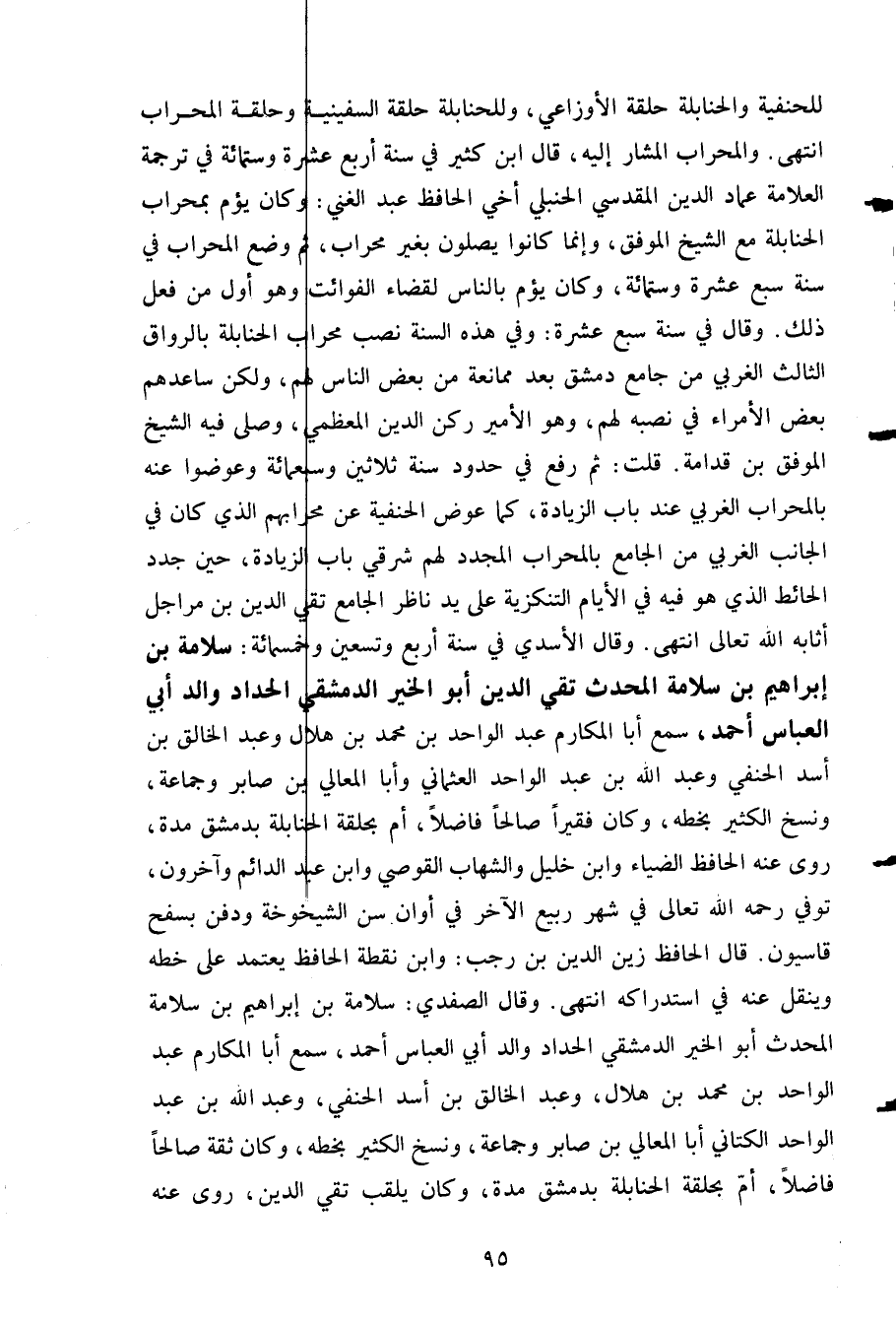 للحنافية والحنابلة حلقة الأوزاعي وللحنابلة حلقة السفينية وحلقة المحراب انتهى. والمحراب المشار إليه قال ابن كثير في سنة أربع عشر وستمائة في ترجمة العلامة عماد الدين المقدسي الحنبلي أخي الحافظ عبد الغني: وكان يؤم بمحراب الحنابلة مع الشيخ الموفق وإنما كانوا يصلون بغير محراب ثم وضع المحراب في سنة سبع عشرة وستمائة وكان يؤم الناس لقضاء الفوائت وهو أول من فعل ذلك وقال في سنة سبع عشرة: وفي هذه السنة نصب محراب الحنابلة بالرواق الثالث الغربي من جامع دمشق بعد ممانعة من بعض الناس لهم ولكن ساعدهم بعض الأمراء في نصبه لهم وهو الأمير ركن الدين المعظمي وصلى فيه الشيخ الموفق بن قدامة قلت: ثم رفع في حدود سنة ثلاثين وسبعمائة وعوضوا عنه بالمحراب الغربي عند باب الزيادة كما عوض الحنفية عن محرابهم الذي كان في الجانب الغربي من الجامع بالمحراب المجدد لهم شرقي باب الزيادة حين جدد الحائط الذي هو فيه في الأيام التنكزية على يد ناظر الجامع تقي الدين بن مراجل أثابه الله تعالى انتهى. وقال الأسدي في سنة أربع وتسعين وخمسمائة: سلامة بن إبراهيم بن سلامة المحدث تقي الدين أبو الخير الدمشقي الحداد والد أبي العباس أحمد سمع أبا المكارم عبد الواحد بن محمد بن هلال وعبد الخالق بن أسد الحنفي وعبد الله بن عبد الواحد العثماني وأبا المعالي بن صابر وجماعة ونسخ الكثير بخطه وكان فقيرا صالحا فاضلا ام بحلقة الحنابلة بدمشق مدة روى عنه الحافظ الضياء وابن خليل والشهاب القوصي وابن عبد الدائم وآخرون توفي رحمه الله تعالى في شهر ربيع الآخر في اوان سن الشيخوخة ودفن بسفح قاسيون قال الحافظ زين الدين بن رجب وابن نقطه الحافظ يعتمد على خطه وينقل عنه في استدراكه انتهى. وقال الصفدي سلامة بن إبراهيم بن سلامة محدث أبو الخير الدمشقي الحداد والد أبي العباس أحمد سمع أبا المكارم عبد الواحد بن محمد بن هلال وعبد الخالق بن أسد الحنفي وعبد الله بن عبد الواحد الكتاني أبا المعالي بن صابر وجماعة ونسخ الكثير بخطه وكان ثقة صالحا فاضلا أم بحلقة الحنابلة بدمشق مدة وكان يلقب تقي الدين روى عنه