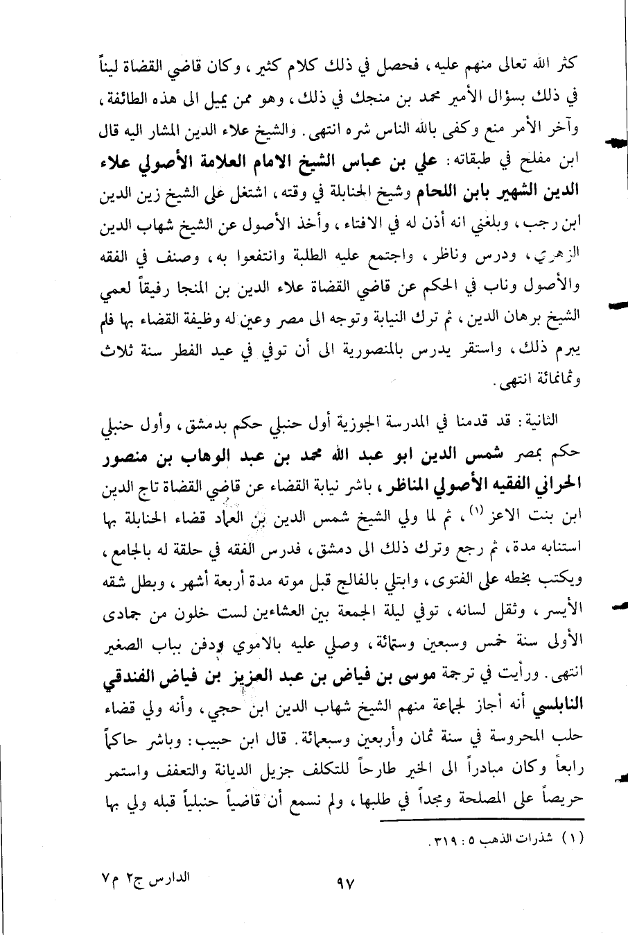 كثر الله تعالى منهم عليه فحصل في ذلك كلام كثير وكان قاضي القضاة لينا في ذلك بسؤال الأمير محمد بن منجك في ذلك وهو ممن يميل إلى هذه الطائفة وآخر الأمر منع وكفى بالله الناس شره انتهى. والشيخ علاء الدين المشار إليه قال ابن مفلح في طبقاته: علي بن عباس الشيخ الإمام العلامة الأصولي علاء الدين الشهير بابن اللحام وشيخ الحنابلة في وقته اشتغل على الشيخ زين الدين ابن رجب وبلغني أنه أذن له في الإفتاء وأخذ الأصول عن الشيخ شهاب الدين الزهري ودرس وناظر واجتمع عليه الطلبة وأنتفعوا به وصنف في الفقه والأصول وناب في الحكم عن قاضي القضاة علاء الدين بن المنجا رفيقا لعمي الشيخ برهان الدين ثم ترك النيابة وتوجه إلى مصر وعين له وظيفة القضاء بها فلم يبرم ذلك واستقر يدرس بالمنصوريه إلى أن توفي في عيد الفطر سنة ثلاث وثمانمائة انتهى.