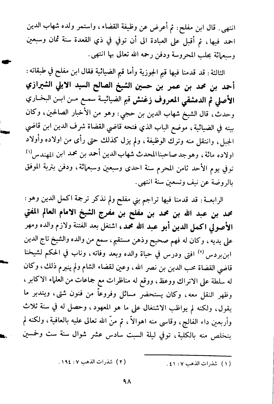 الرابعة: قد قدمنا فيها تراجم بني مفلح ولم نذكر ترجمة أكمل الدين وهو محمد بن عبد الله بن محمد بن مفلح بن مفرج الشيخ الإمام العالم المفتي الأصولي أكمل الدين أبو عبد الله محمد اشتغل بعد الفتنة ولازم والده ومهر على يديه وكان له فهم صحيح وذهن مستقيم سمع من والده والشيخ تاج الدين ابن بردس2 أفتى ودرس في حياة والده وبعد وفاته وناب في الحكم لشيخنا قاضي القضاة محب الدين بن نصر الله وعين لقضاء الشام ولم ينبرم ذلك وكان له سلطة على الأتراك ووعظ ووقع له مناظرات مع جماعات من العلماء الأكابر وظهر النقل معه وكان يستحضر مسائل وفروعا من فنون شتى ويتدبر ما يقول ولكنه لم يواظب الاشتغال على ما هو المعهود وحصل له في سنة ثلاث وأربعين داء ألفالج وقاسي منه أهوالا ثم من الله تعالى عليه بالعافية ولكنه لم يتخلص من بالكلية توفي ليلة السبت سادس عشر شوال سنة ست وخمسين
