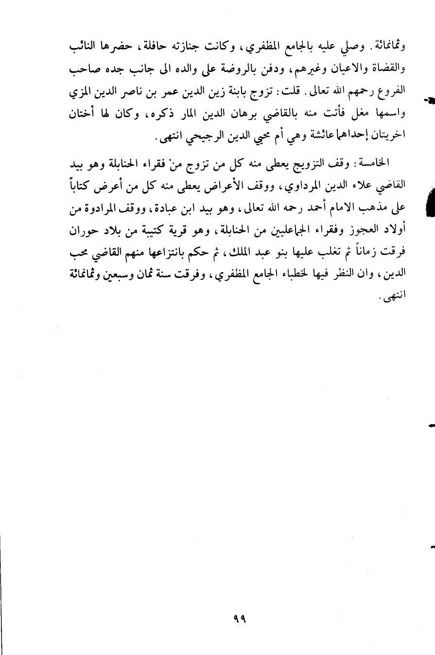 الخامسة: وقف التزويج يعطي منه كل من تزوج من فقراء الحنابلة وهو بيد القاضي علاء الدين المرداوي ووقف الأعراض يعطي منه كل من أعرض كتابا على مذهب الإمام أحمد رحمه الله تعالى وهو بيد ابن عبادة ووقف المرادوة من أولاد العجوز وفقراء الجماعلين من الحنابلة وهو قرية كتيبة من بلاد حوران فرقت زمانا ثم تغلب عليها بنو عبد الملك ثم حكم بانتزاعها منهم القاضي محب الدين وإن النظر فيها الخطباء الجامع المظفري وفرقت سنة ثمان وسبعين وثمانمائة انتهى.