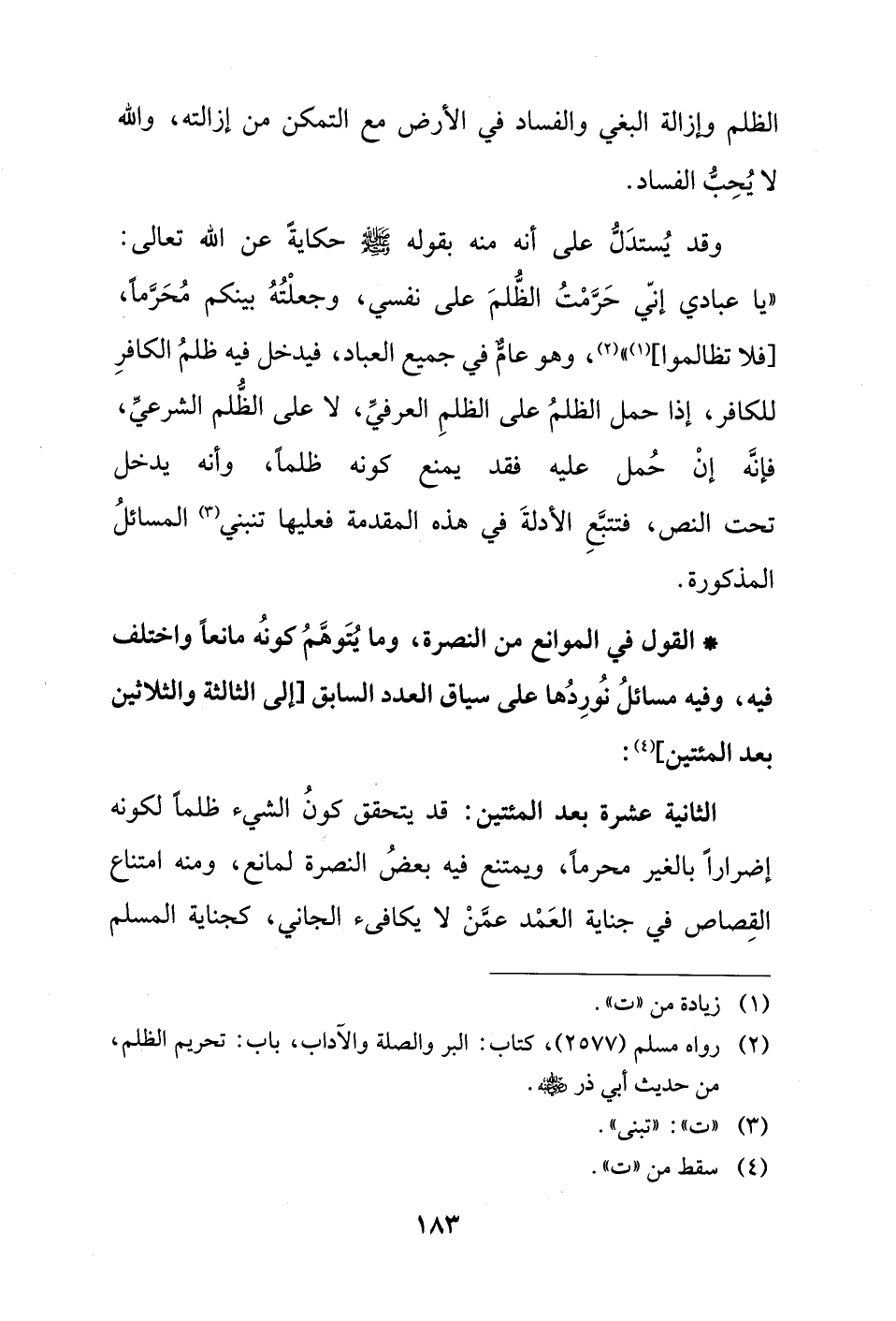 الثانية عشرة بعد المئتين: قد يتحقق كونُ الشيء ظلمًا لكونه إضرارًا بالغير محرمًا، ويمتنع فيه بعضُ النصرة لمانع، ومنه امتناع القِصاص في جناية العَمْد عمَّنْ لا يكافئ الجاني، كجناية المسلم