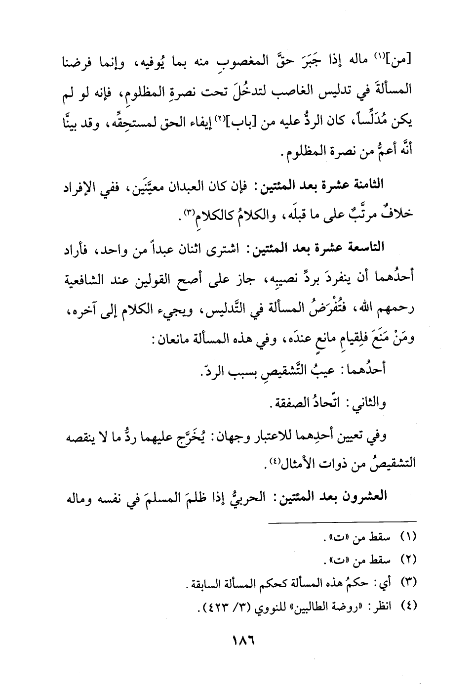 التاسعة عشرة بعد المئتين: اشترى اثنان عبدًا من واحد، فأراد أحدُهما أن ينفردَ بردِّ نصيبِه، جاز على أصح القولين عند الشافعية رحمهم الله، فتُفْرَضُ المسألة في التَّدليس، ويجيء الكلام إلى آخره، ومَنْ مَنعَ فلِقيامِ مانعٍ عندَه، وفي هذه المسألة مانعان: