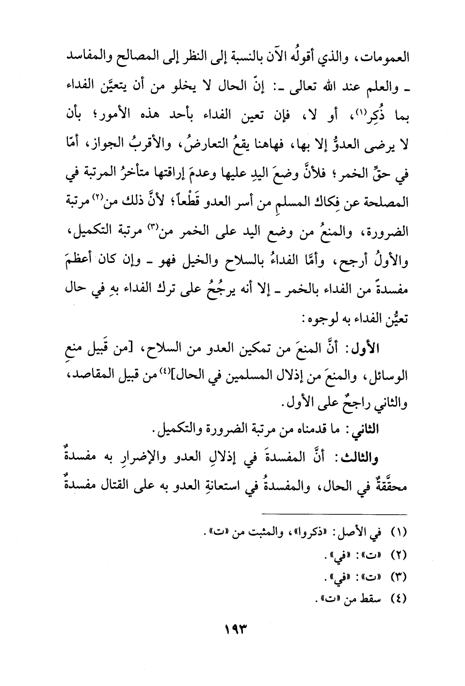 العمومات، والذي أقولُه الآن بالنسبة إلى النظر إلى المصالح والمفاسد - والعلم عند الله تعالى -: إنّ الحال لا يخلو من أن يتعيَّن الفداء بما ذُكِر (¬1)، أو لا، فإن تعين الفداء بأحد هذه الأمور؛ بأن لا يرضى العدوُّ إلا بها، فها هنا يقعُ التعارضُ، والأقربُ الجواز، أمّا في حقِّ الخمر؛ فلأنَّ وضعَ اليدِ عليها وعدمَ إراقتها متأخرُ المرتبة في المصلحة عن فِكاك المسلمِ من أسر العدو قَطْعًا؛ لأنَّ ذلك من (¬2) مرتبة الضرورة، والمنعُ من وضع اليد على الخمر من (¬3) مرتبة التكميل، والأولُ أرجح، وأمَّا الفداءُ بالسلاح والخيل فهو - وإن كانْ أعظمَ مفسدةً من الفداء بالخمر - إلا أنه يرجُحُ على ترك الفداء بهِ في حال تعيُّن الفداء به لوجوه: