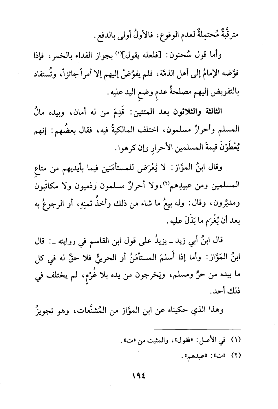 الثالثة والثلاثون بعد المئتين: قَدِمَ من له أمان، وبيده مالُ المسلم وأحرارٌ مسلمون، اختلف المالكيةُ فيه، فقال بعضُهم: إنهم يُعْطَوْنَ قيمةَ المسلمين الأحرارِ وإن كرهوا.