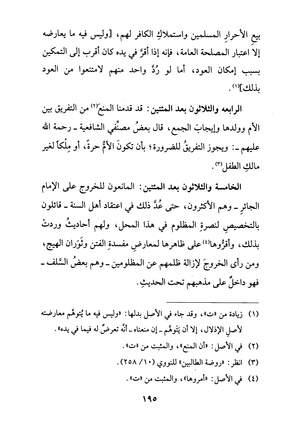 الخامسة والثلاثون بعد المئتين: المانعون للخروج على الإمام الجائرِ - وهم الأكثرون، حتى عُدَّ ذلك في اعتقاد أهل السنة - قائلون بالتخصيصِ لنصرةِ المظلوم في هذا المحل، ولهم أحاديثُ وردتْ بذلك، وأقرّوها (¬4) على ظاهرها لمعارضِ مفسدةِ الفتن وثَوَران الهيج، ومن رأى الخروجَ لإزالة ظلمهم عن المظلومين - وهم بعضُ السَّلف - فهو داخلٌ على مذهبهم تحت الحديثِ.