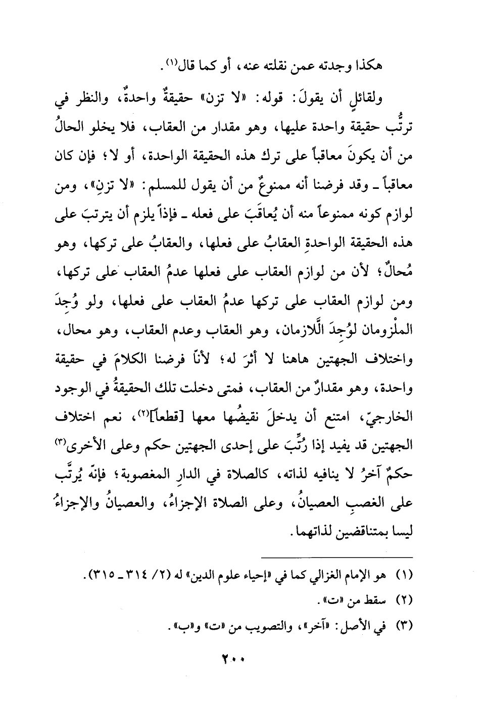 ولقائلٍ أن يقولَ: قوله: "لا تزن" حقيقةٌ واحدةٌ، والنظر في ترتيب حقيقة واحدة عليها، وهو مقدار من العقاب، فلا يخلو الحالُ من أن يكونَ معاقبًا على ترك هذه الحقيقة الواحدة، أو لا؛ فإن كأن معاقبًا - وقد فرضنا أنه ممنوعٌ من أن يقول للمسلم: "لا تزنِ"، ومن لوازم كونه ممنوعًا منه أن يُعاقَبَ على فعله - فإذاً يلزم أن يترتبَ على هذه الحقيقة الواحدةِ العقابُ على فعلها، والعقابُ على تركها، وهو مُحالٌ؛ لأن من لوازم العقاب على فعلها عدمُ العقابْ على تركها، ومن لوازم العقاب على تركها عدمُ العقاب على فعلها، ولو وُجِدَ الملْزومان لوُجِدَ الَّلازمان، وهو العقاب وعدم العقاب، وهو محال، واختلاف الجهتين هاهنا لا أثرَ له؛ لأنّا فرضنا الكلامَ في حقيقة واحدة، وهو مقدارٌ من العقاب، فمتى دخلت تلك الحقيقةُ في الوجود الخارجيّ، امتنع أن يدخلَ نقيضُها معها [قطعا] (¬2)، نعم اختلاف الجهتين قد يفيد إذا رتِّبَ على إحدى الجهتين حكم وعلى الأخرى (¬3) حكمٌ آخرُ لا ينافيه لذاته، كالصلاة في الدارِ المغصوبة؛ فإنة يُرتَّب على الغصبِ العصيانُ، وعلى الصلاة الإجزاءُ، والعصيانُ والإجزاءُ ليسا بمتناقضين لذاتهما.