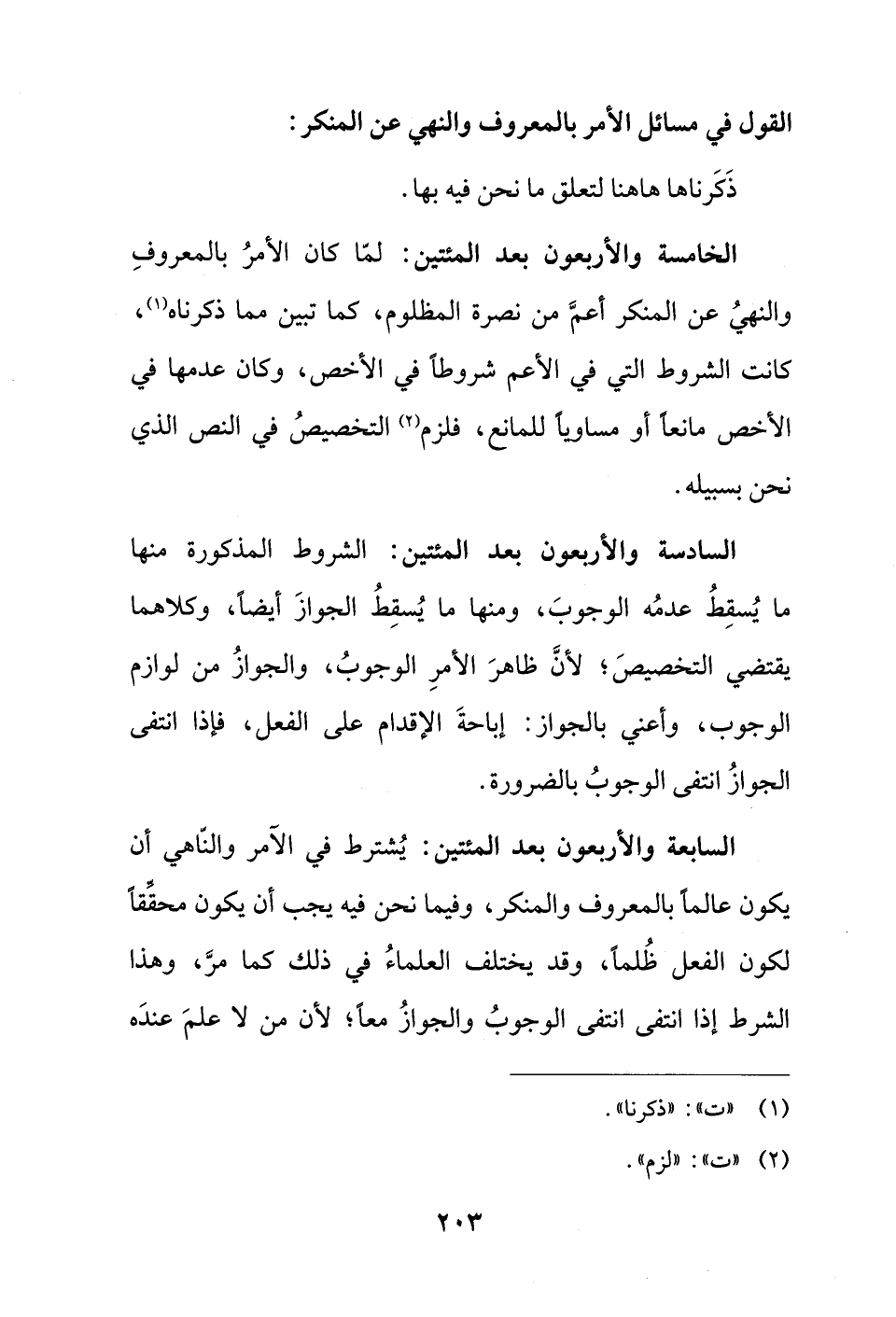 الخامسة والأربعون بعد المئتين: لمّا كان الأمرُ بالمعروفِ والنهيُ عن المنكر أعمَّ من نصرة المظلوم، كما تبين مما ذكرناه (¬1)، كانت الشروط التي في الأعم شروطًا في الأخص، وكان عدمها في الأخصر مانعًا أو مساويًا للمانع، فلزم (¬2) التخصيصُ في النص الذي نحن بسبيله.