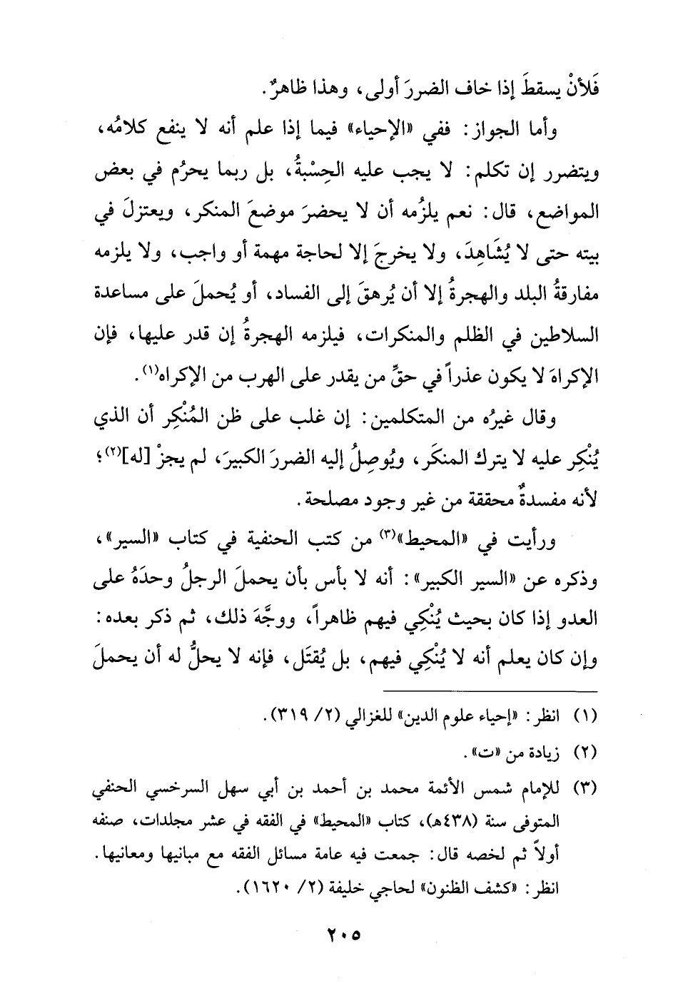 وأما الجواز: ففي "الإحياء" فيما إذا علم أنه لا ينفع كلامُه، ويتضرر إن تكلم: لا يجب عليه الحِسْبةُ، بل ربما يحرُم في بعض المواضع، قال: نعم يلزُمه أن لا يحضرَ موضعَ المنكر، ويعتزلَ في بيته حتى لا يُشَاهِدَ، ولا يخرجَ إلا لحاجة مهمة أو واجب، ولا يلزمه مفارقةُ البلد والهجرةُ إلا أن يُرهقَ إلى الفساد، أو يُحملَ على مساعدة السلاطين في الظلم والمنكرات، فيلزمه الهجرةُ إن قدر عليها، فإن الإكراهَ لا يكون عذراً في حقِّ من يقدر على الهرب من الإكراه (¬1).