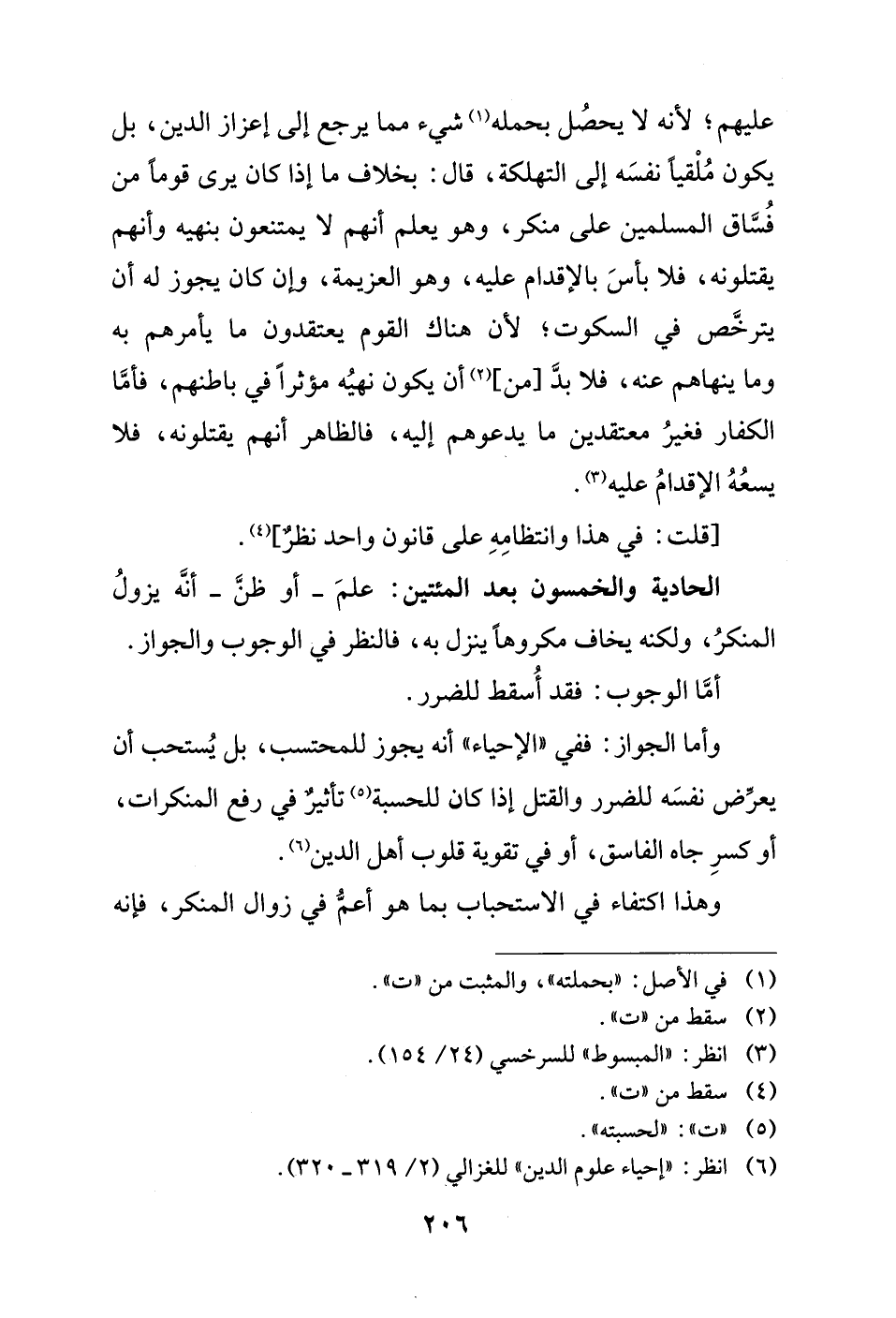 الحادية والخمسون بعد المئتين: علمَ - أو ظنَّ - أنَّه يزولُ المنكرُ، ولكنه يخاف مكروهاً ينزل به، فالنظر في الوجوب والجواز.