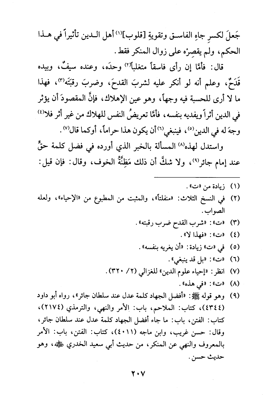 (¬9) وهو قوله - صلى الله عليه وسلم -: "أفضل الجهاد كلمة عدل عند سلطان جائر"، رواه أبو داود (4344)، كتاب: الملاحم، باب: الأمر والنهي، والترمذي (2174)، كتاب: الفتن، باب: ما جاء أفضل الجهاد كلمة عدل عند سلطان جائر، وقال: حسن غريب، وابن ماجه (4011)، كتاب: الفتن، باب: الأمر بالمعروف والنهي عن المنكر، من حديث أبي سعيد الخدري - رضي الله عنه -، وهو حديث حسن.