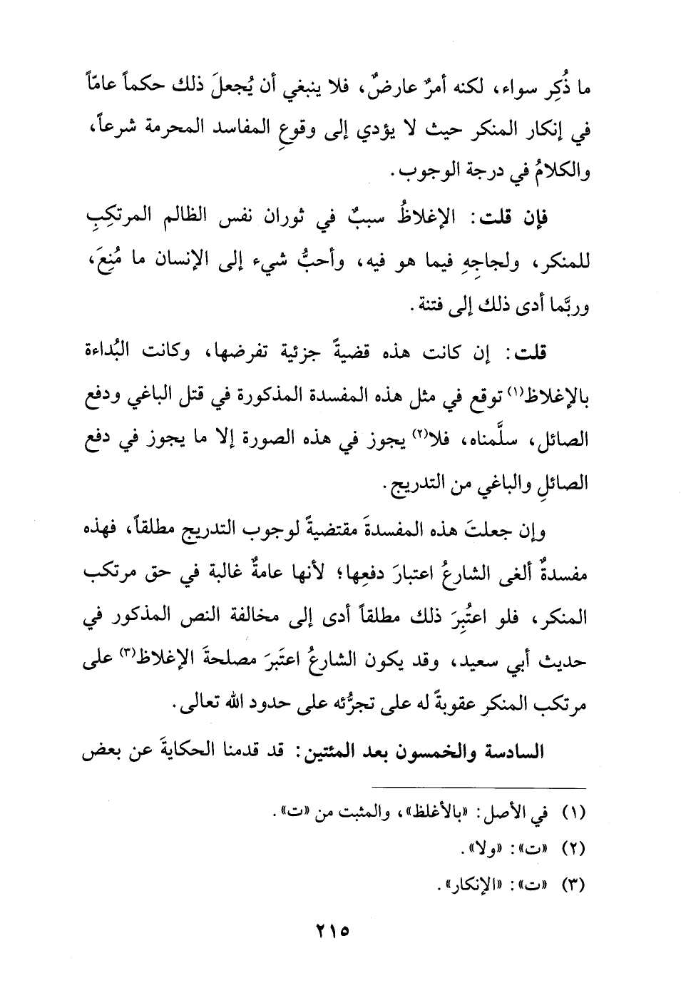 وإن جعلتَ هذه المفسدةَ مقتضيةً لوجوب التدريج مطلقاً، فهذه مفسدة ألغى الشارعُ اعتبارَ دفعِها؛ لأنها عامةٌ غالبة في حق مرتكب المنكر، فلو اعتُبِرَ ذلك مطلقا أدى إلى مخالفة النص المذكور في حديث أبي سعيد، وقد يكون الشارعُ اعتَبرَ مصلحةَ الإغلاظ (¬3) على مرتكب المنكر عقوبة له على تجرّئه على حدود الله تعالى.