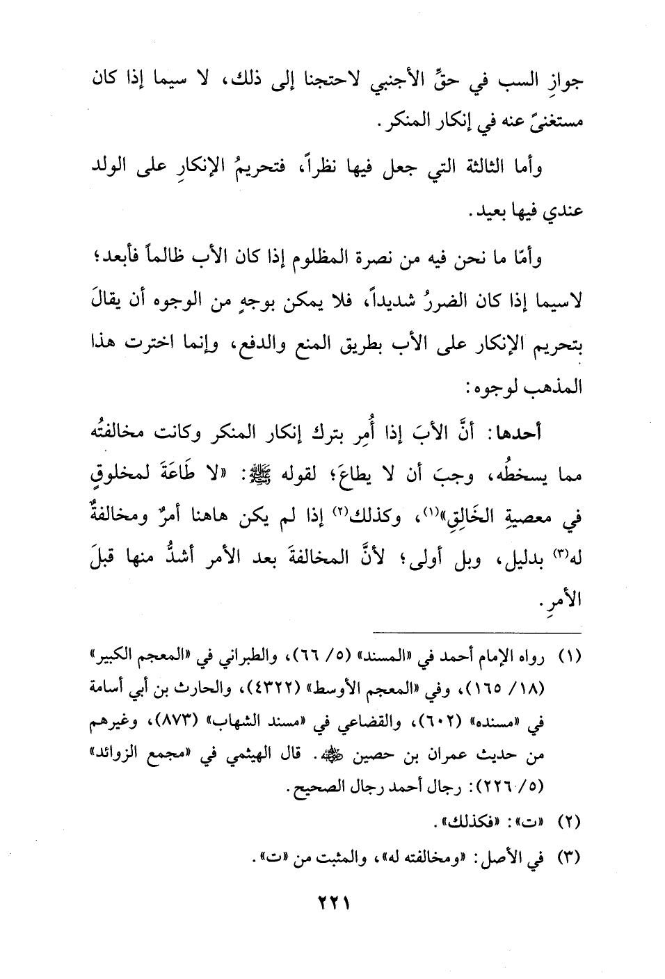وأمّا ما نحن فيه من نصرة المظلوم إذا كان الأب ظالماً فأبعد؛ لاسيما إذا كان الضررُ شديداً، فلا يمكن بوجهٍ من الوجوه أن يقالَ بتحريم الإنكار على الأب بطريق المنع والدفع، وإنما اخترت هذا المذهب لوجوه: