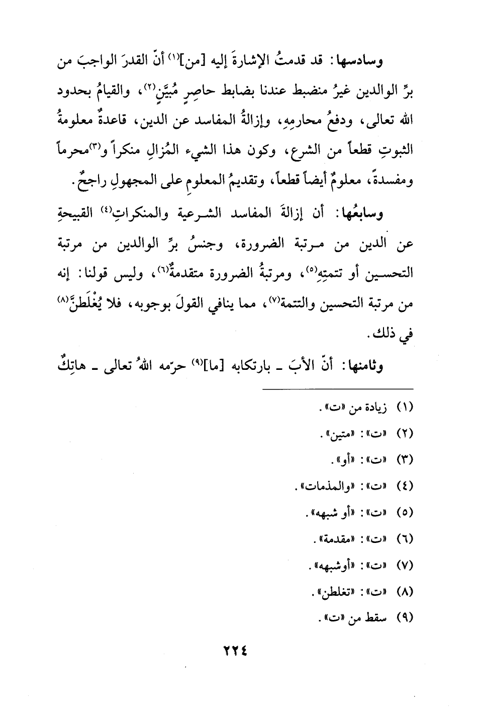 وسابعُها: أن إزالةَ المفاسد الشرعية والمنكراتِ (¬4) القبيحةِ عن الدين من مرتبة الضرورة، وجنسُ برِّ الوالدين من مرتبة التحسين أو تتمتِهِ (¬5)، ومرتبةُ الضرورة متقدمةٌ (¬6)، وليس قولنا: إنه من مرتبة التحسين والتتمة (¬7)، مما ينافي القولَ بوجوبه، فلا يُغْلَطنَّ (¬8) في ذلك.