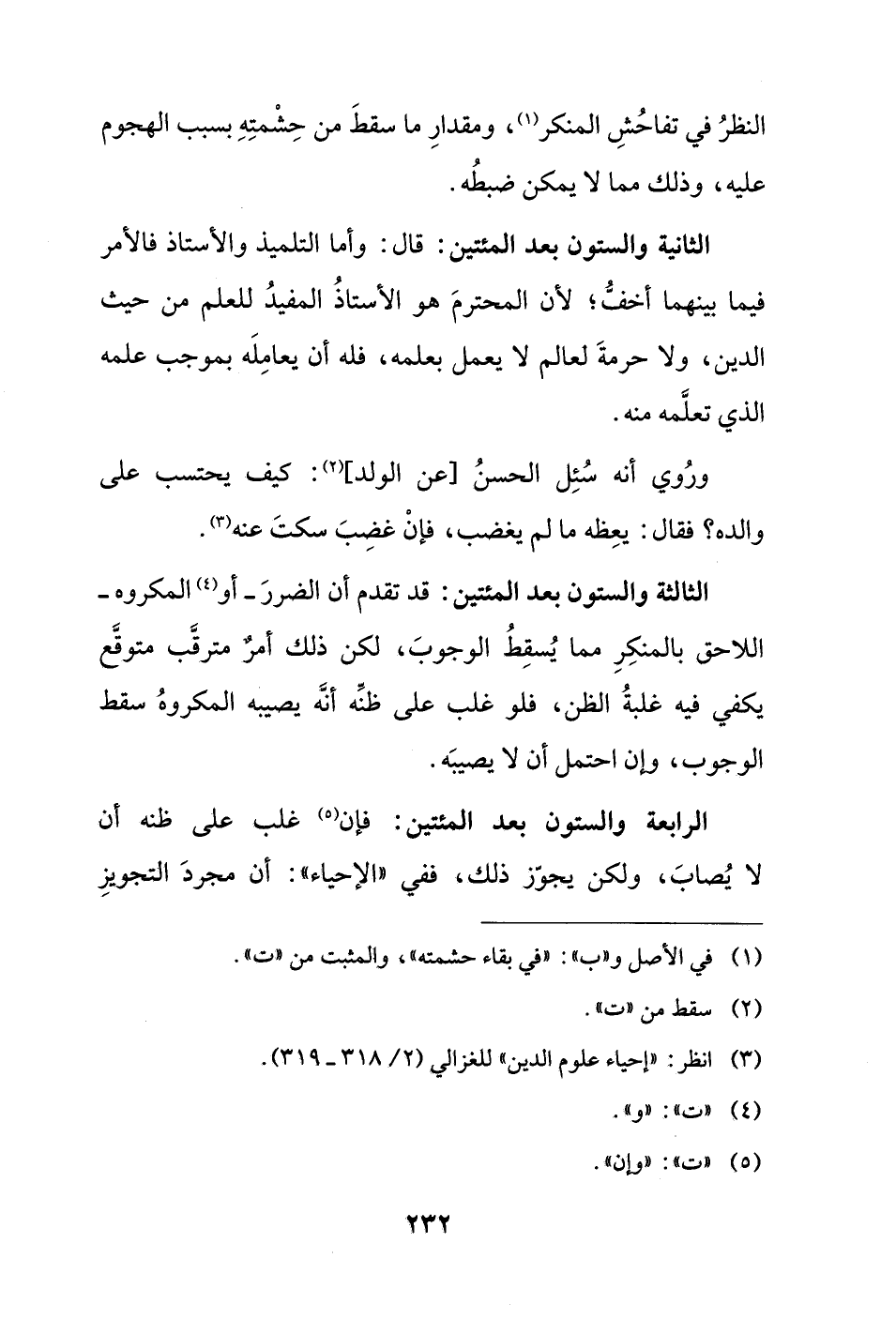 الثانية والستون بعد المئتين: قال: وأما التلميذ والأستاذ فالأمر فيما بينهما أخفُّ؛ لأن المحترمَ هو الأستاذُ المفيدُ للعلم من حيث الدين، ولا حرمةَ لعالم لا يعمل بعلمه، فله أن يعامِلَه بموجب علمه الذي تعلَّمه منه.