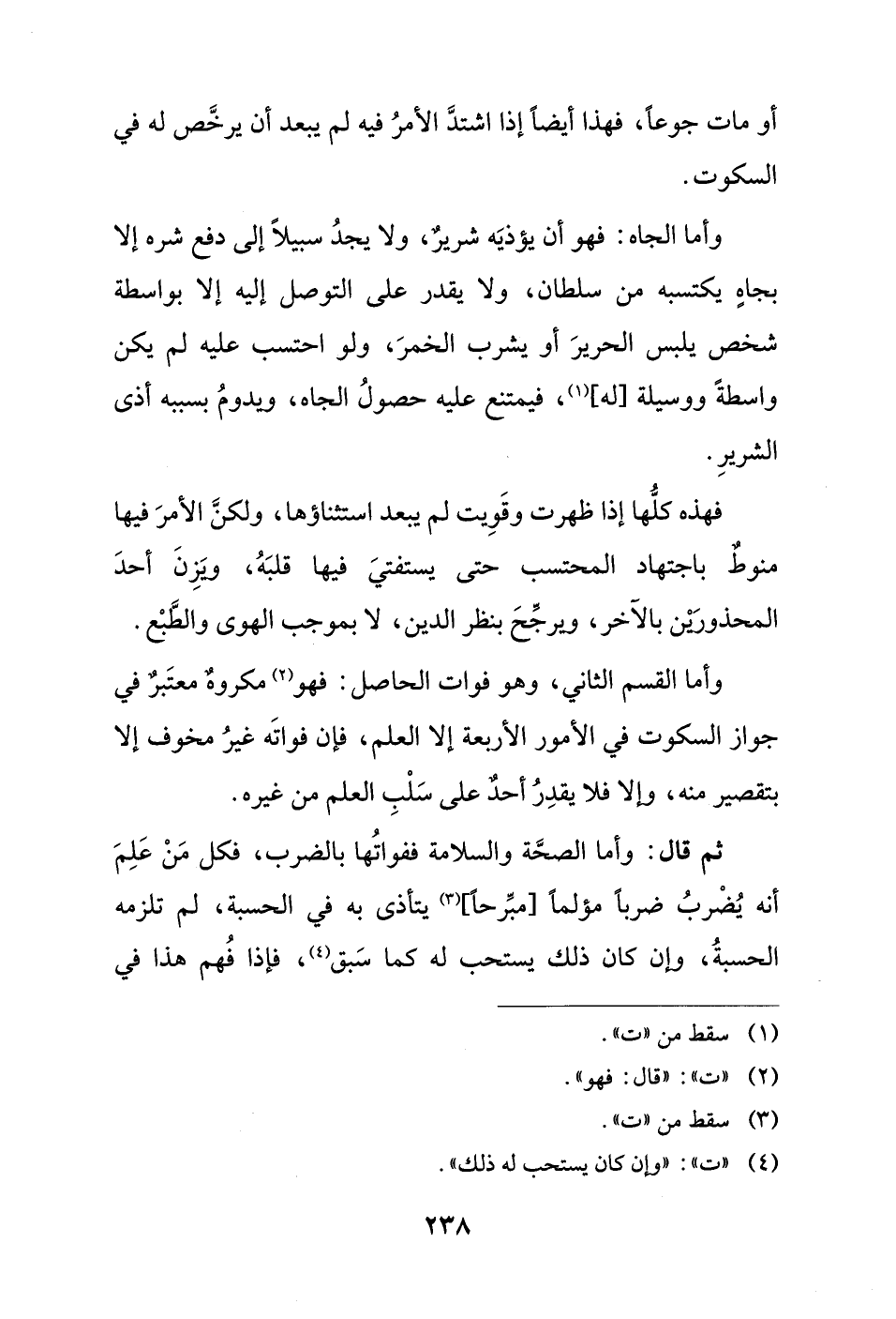 وأما القسم الثاني، وهو فوات الحاصل: فهو (¬2) مكروهٌ معتَبرٌ في جواز السكوت في الأمور الأربعة إلا العلم، فإن فواتَه غيرُ مخوف إلا بتقصير منه، وإلا فلا يقدِرُ أحدٌ على سَلْبِ العلم من غيره.