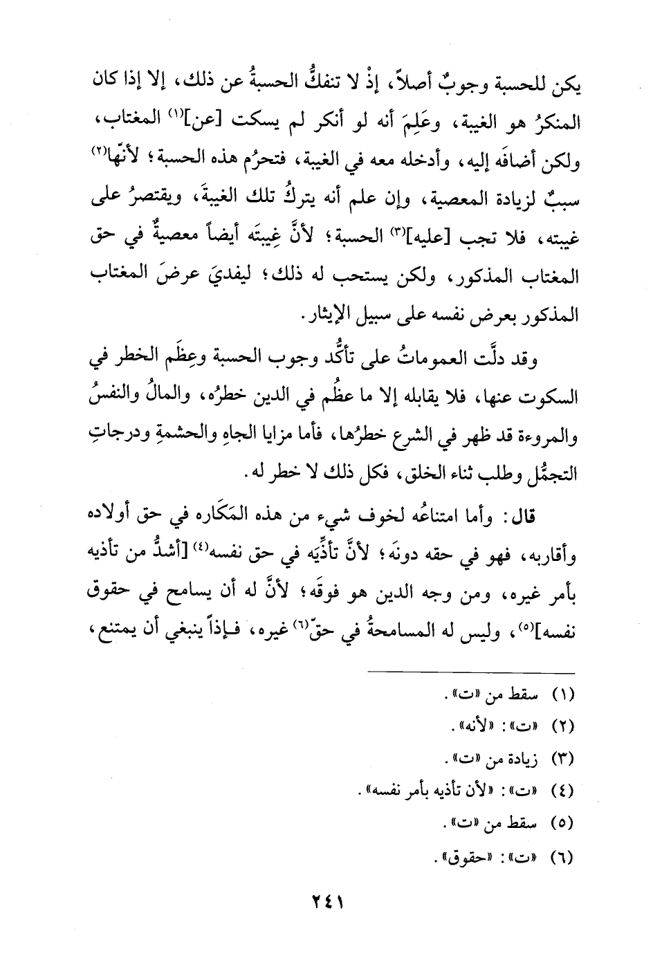 وقد دلَّت العموماتُ على تأكُّد وجوب الحسبة وعِظَم الخطر في السكوت عنها، فلا يقابله إلا ما عظُم في الدين خطرُه، والمالُ والنفسُ والمروءة قد ظهر في الشرع خطرُها، فأما مزايا الجاهِ والحشمةِ ودرجاتِ التجمُّل وطلب ثناء الخلق، فكل ذلك لا خطر له.