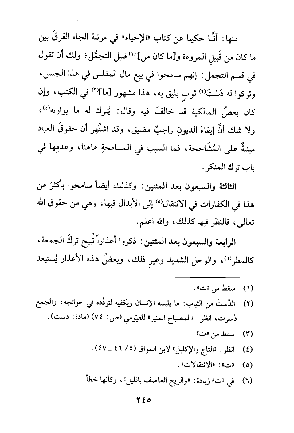 منها: أنَّا حكينا عن كتاب "الإحياء" في مرتبة الجاه الفرقَ بين ما كان من قَبيلِ المروءة و [ما كان من] (¬1) قبيل التجمُّل؛ ولك أن تقول في قسم التجمل: إنهم سامحوا في بيع مال المفلس في هذا الجنس، وتركوا له دَستَ (¬2) ثوبٍ يليق يه، هذا مشهور [ما] (¬3) في الكتب، وإن كان بعضُ المالكية قد خالفَ فيه وقال: يُترك له ما يواريه (¬4)، ولا شك أنَّ إيفاءَ الديونِ واجبٌ مضيق، وقد اشتُهر أن حقوقَ العباد مبنيةٌ على المُشَاححة، فما السبب في المسامحةِ هاهنا، وعدمِها في باب ترك المنكر.