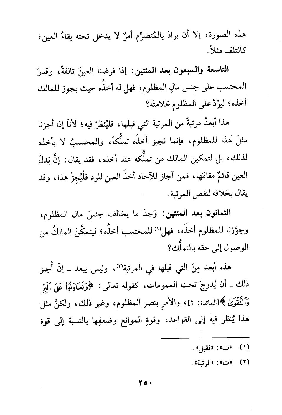 التاسعة والسبعون بعد المئتين: إذا فرضنا العينَ تالفةً، وقدرَ المحتسب على جنس مالِ المظلوم، فهل له أخذُه حيث يجوز للمالك أخذه؛ ليرُدَّ على المظلوم ظلامتَه؟