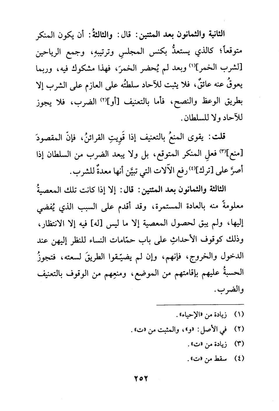الثانية والثمانون بعد المئتين: قال: والثالثةُ: أن يكون المنكر متوقعاً؛ كالذي يستعدُّ بكنس المجلسِ وترتيبهِ، وجمع الرياحين [لشرب الخمر] (¬1) وبعد لم يُحضر الخمرَ، فهذا مشكوك فيه، وربما يعوقُ عنه عائق، فلا يثبت للآحاد سلطتُه على العازم على الشرب إلا بطريق الوعظ والنصح، فأما بالتعنيف [أو] (¬2) الضرب، فلا يجوز للآحاد ولا للسلطان.
