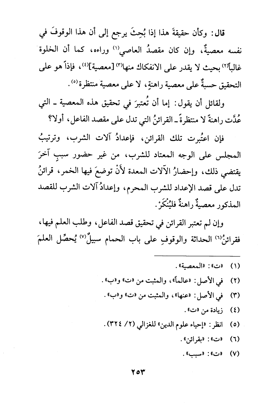 ولقائل أن يقول: إما أن تُعتبرَ في تحقيق هذه المعصية - التي عُدَّت راهنةً لا منتظرة - القرائنُ التي تدل على مقصد الفاعل، أولا؟