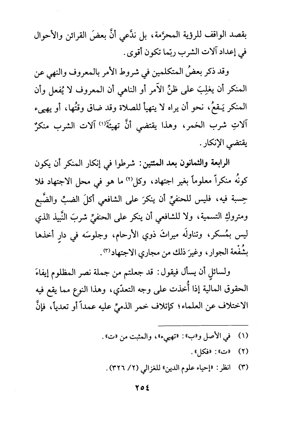 الرابعة والثمانون بعد المئتين: شرطوا في إنكار المنكر أن يكون كونُه منكرًا معلومًا بغير اجتهاد، وكل (¬2) ما هو في محل الاجتهاد فلا حِسبة فيه، فليس للحنفيِّ أن ينكرَ على الشافعي أكلَ الضبِّ والضَّبع ومتروكِ التسمية، ولا للشافعي أن ينكر على الحنفيِّ شربَ النَّبيذ الذي ليس بمُسكر، وتناولَه ميراثَ ذوي الأرحام، وجلوسَه في دارٍ أخذها بشُفْعة الجوار، وغيرَ ذلك من مجاري الاجتهاد (¬3).