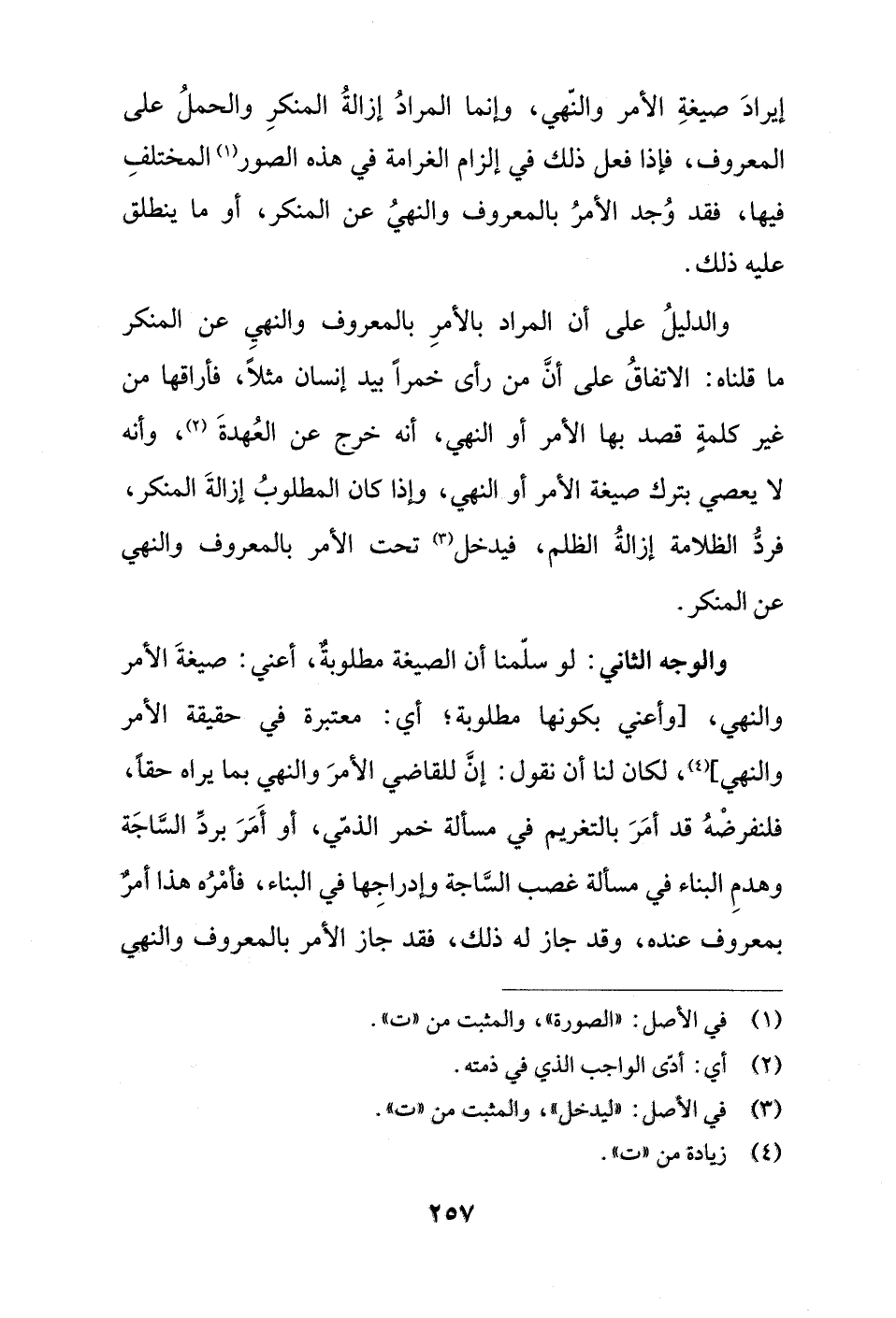 والوجه الثاني: لو سلّمنا أن الصيغة مطلوبةٌ، أعني: صيغةَ الأمر والنهي، [وأعني بكونها مطلوبة؛ أي: معتبرة في حقيقة الأمر والنهي] (¬4)، لكان لنا أن نقول: إنَّ للقاضي الأمرَ والنهي بما يراه حقًّا، فلنفرضْهُ قد أمَرَ بالتغريم في مسألة خمر الذمّي، أو أَمَرَ بردِّ السَّاجَة وهدمِ البناء في مسألة - غصب السَّاجة وإدراجِها في البناء، فأمْرُه هذا أمرٌ بمعروف عنده، وقد جاز له ذلك، فقد جاز الأمر بالمعروف والنهي
