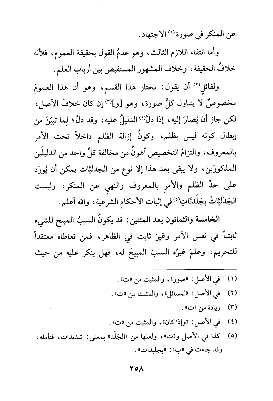 ولقائلٍ (¬2) أن يقول: نختار هذا القسم، وهو أن هذا العمومَ مخصوصٌ لا يتناول كلَّ صورة، وهو [و] (¬3) إن كان خلافَ الأصل، لكن جاز أن يُصارَ إليه، إذا دلَّ (¬4) الدليلُ عليه، وقد دلَّ؛ لِما تبيّنَ من إبطال كونه ليس بظلم، وكونُ إزالة الظلم داخلًا تحت الأمر بالمعروف، والتزامُ التخصيص أهونُ من مخالفة كلِّ واحد من الدليلَين المذكورَين، ولا يبقى بعد هذا إلا نوع من الجدليَّات يمكن أن يُورَد على حدِّ الظلم والأمرِ بالمعروف والنهيِ عن المنكر، وليست الجَدَليَّاتُ بجَلَديَّاتٍ (¬5) في إثبات الأحكام الشرعية، والله أعلم.